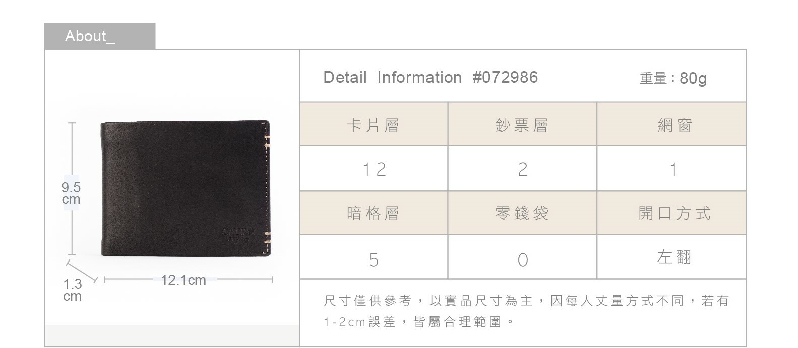 鈔票層2個、卡片層12個、證件窗1個、暗格層5個