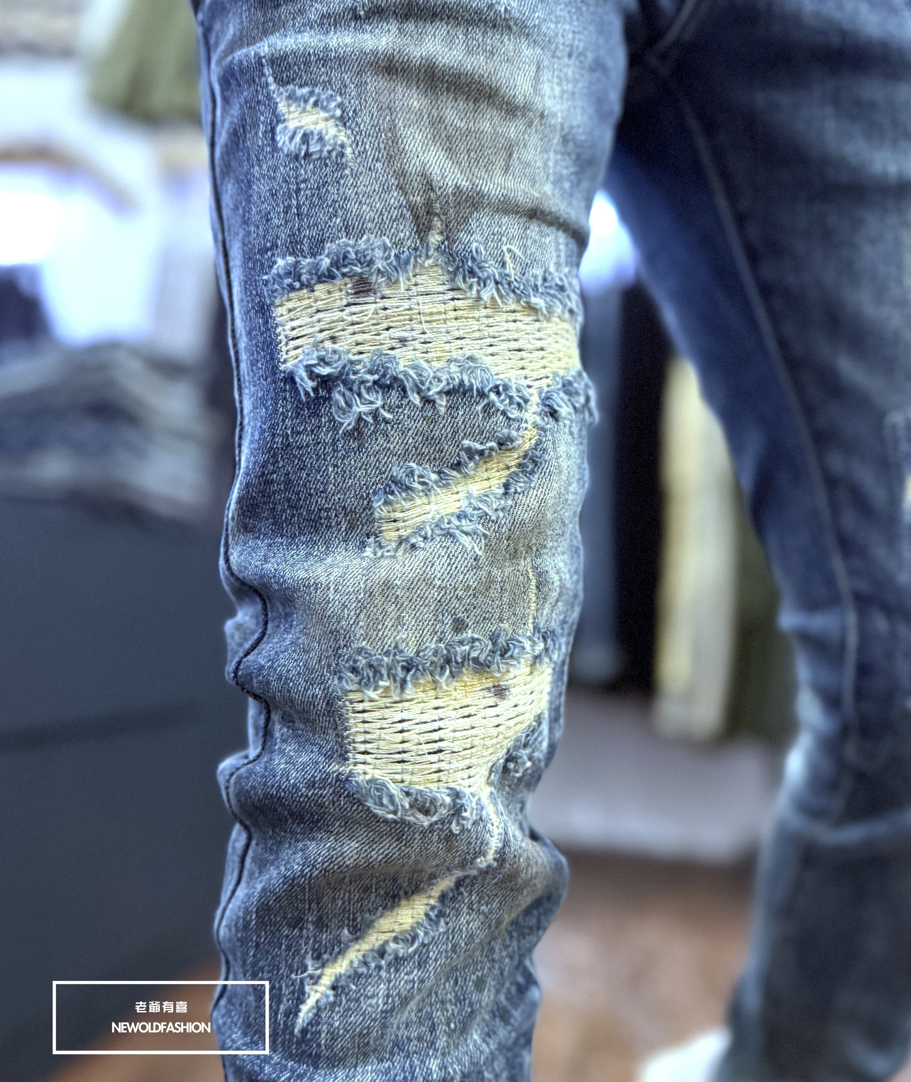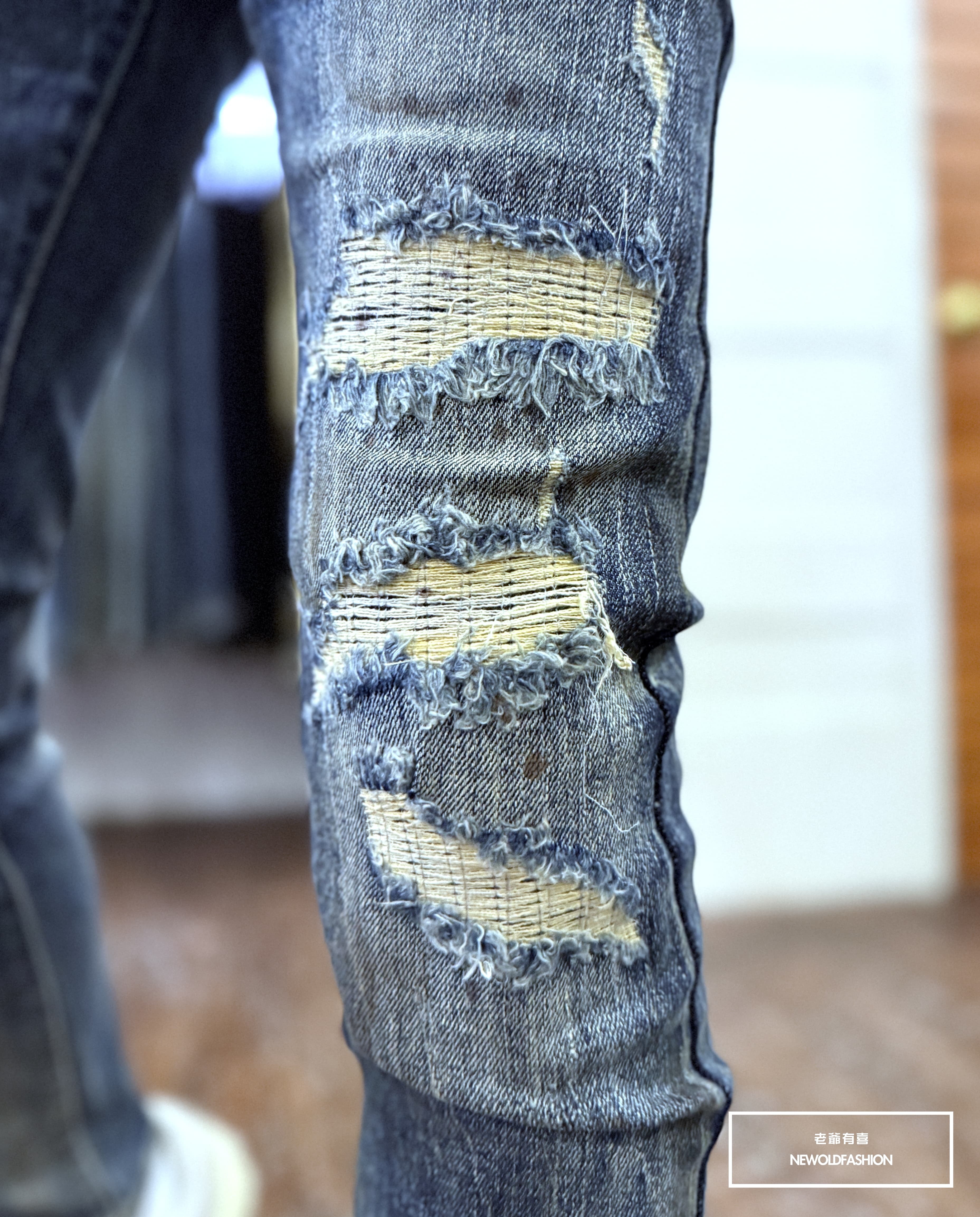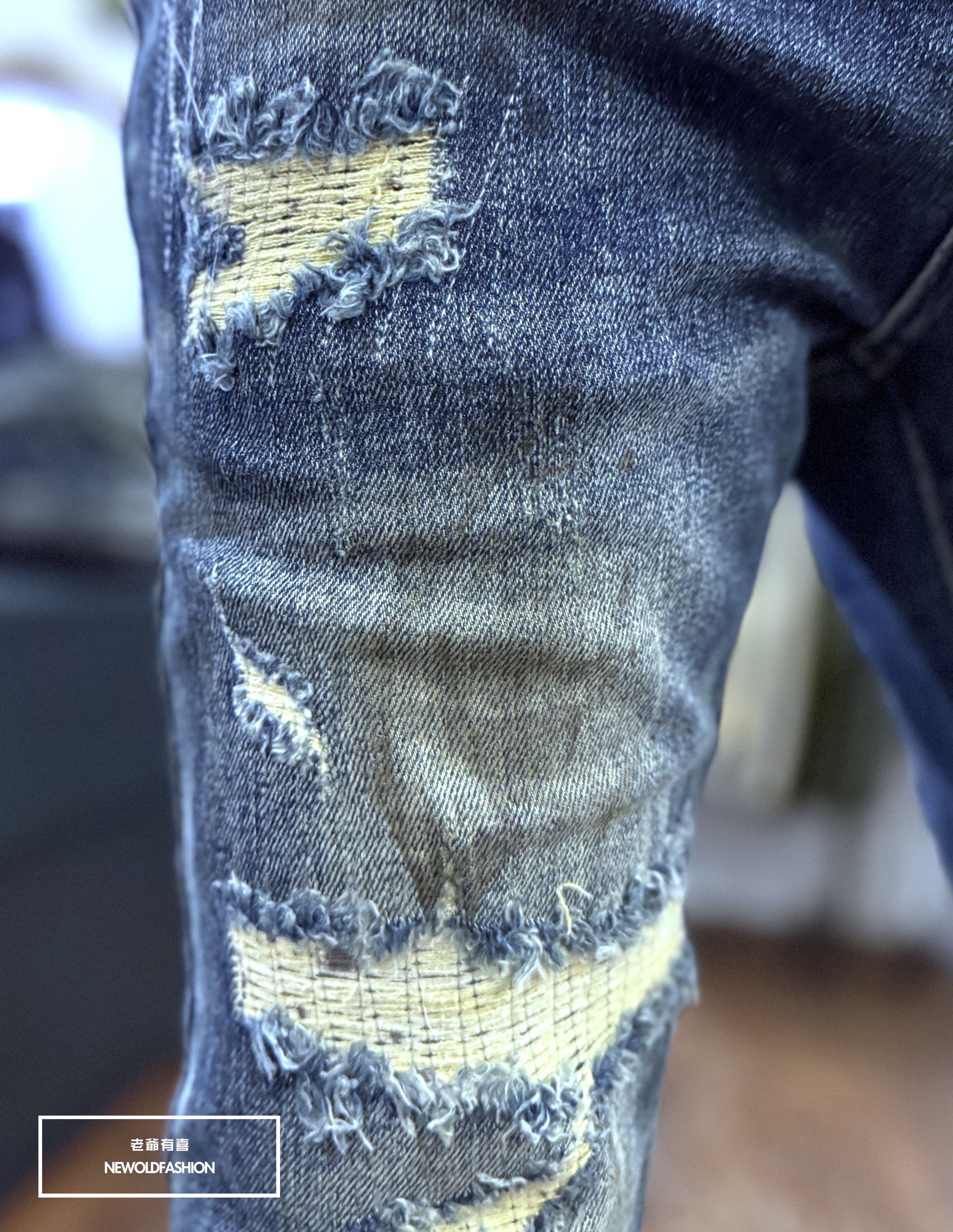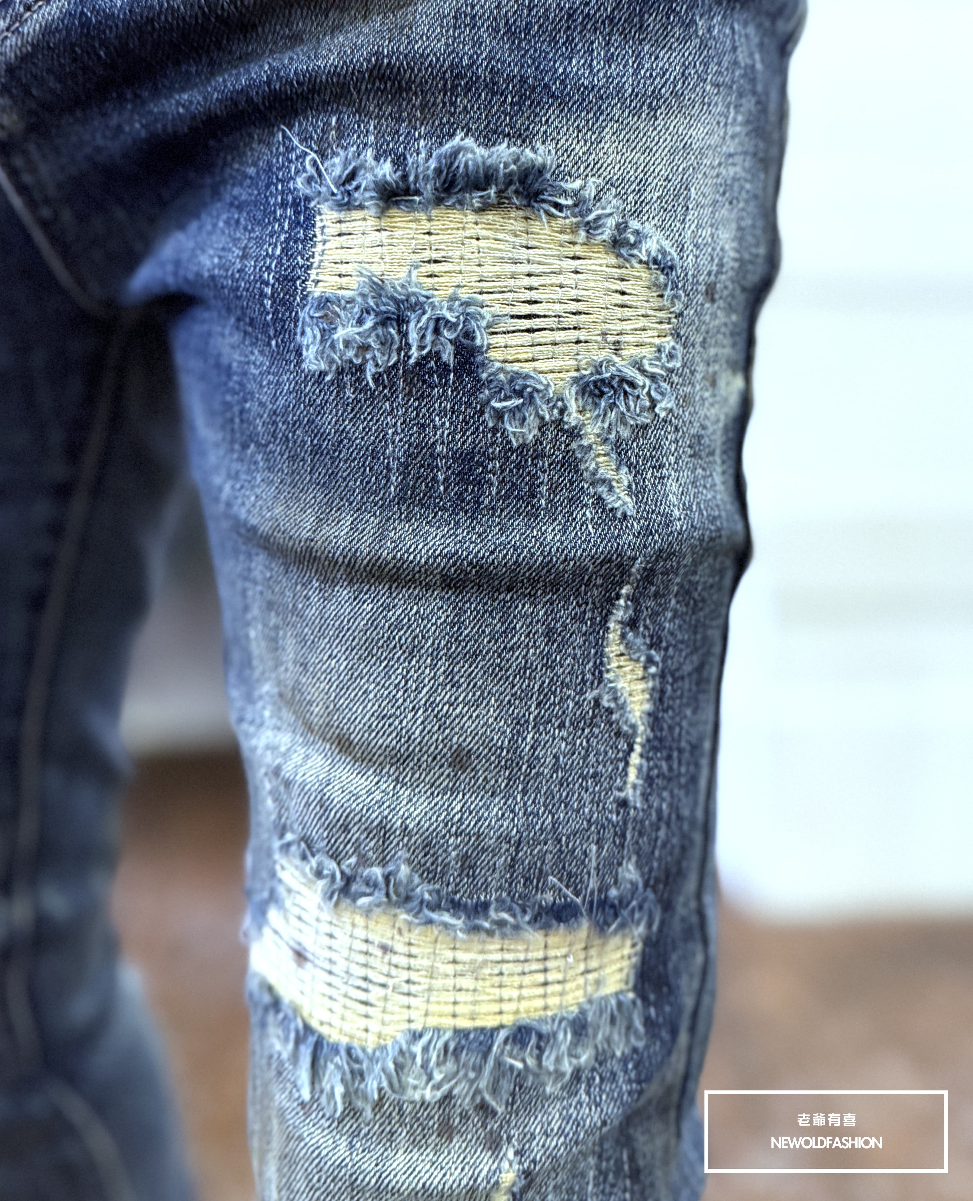 仿舊刷痕、大面積破壞車縫補丁造型設計!