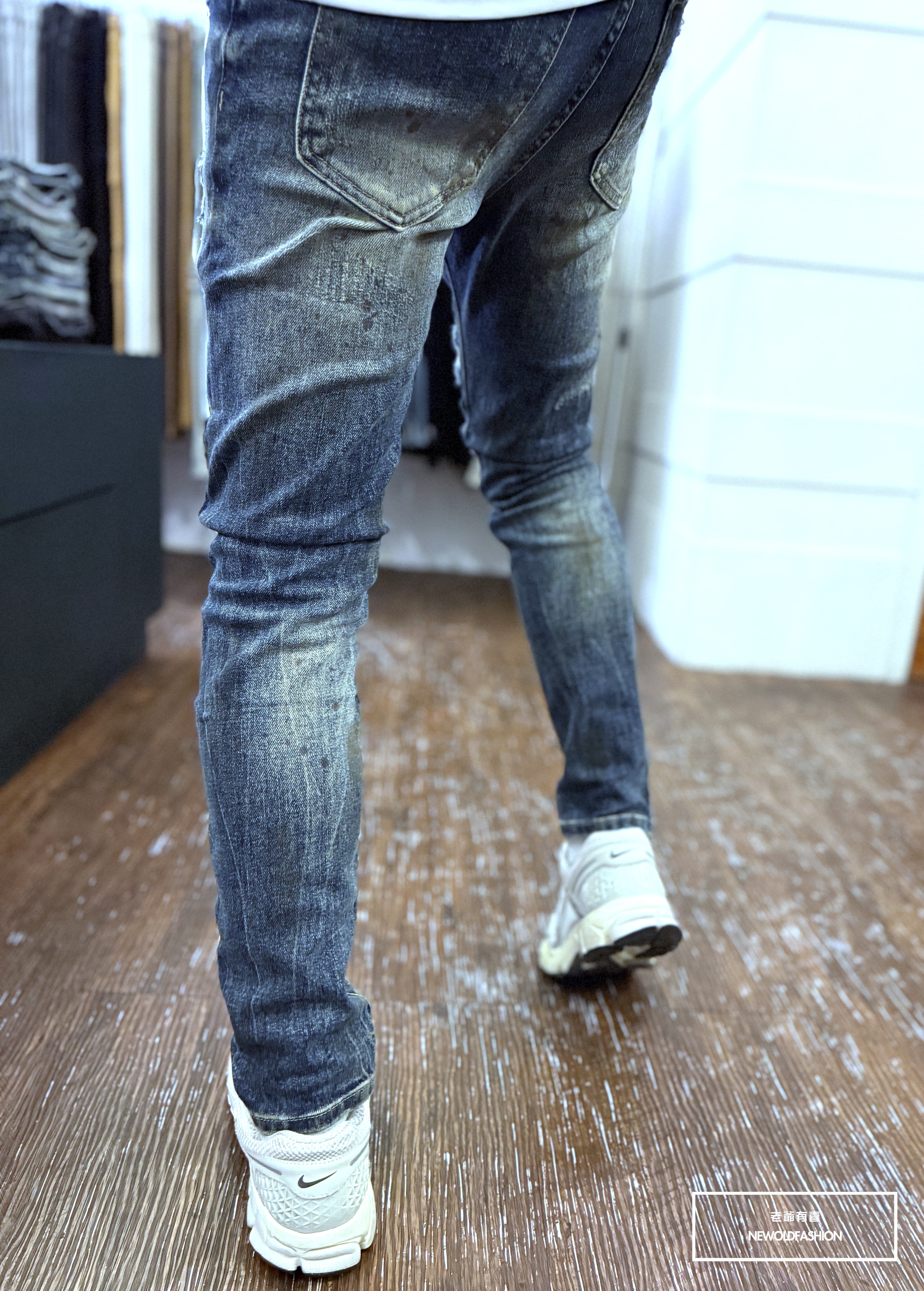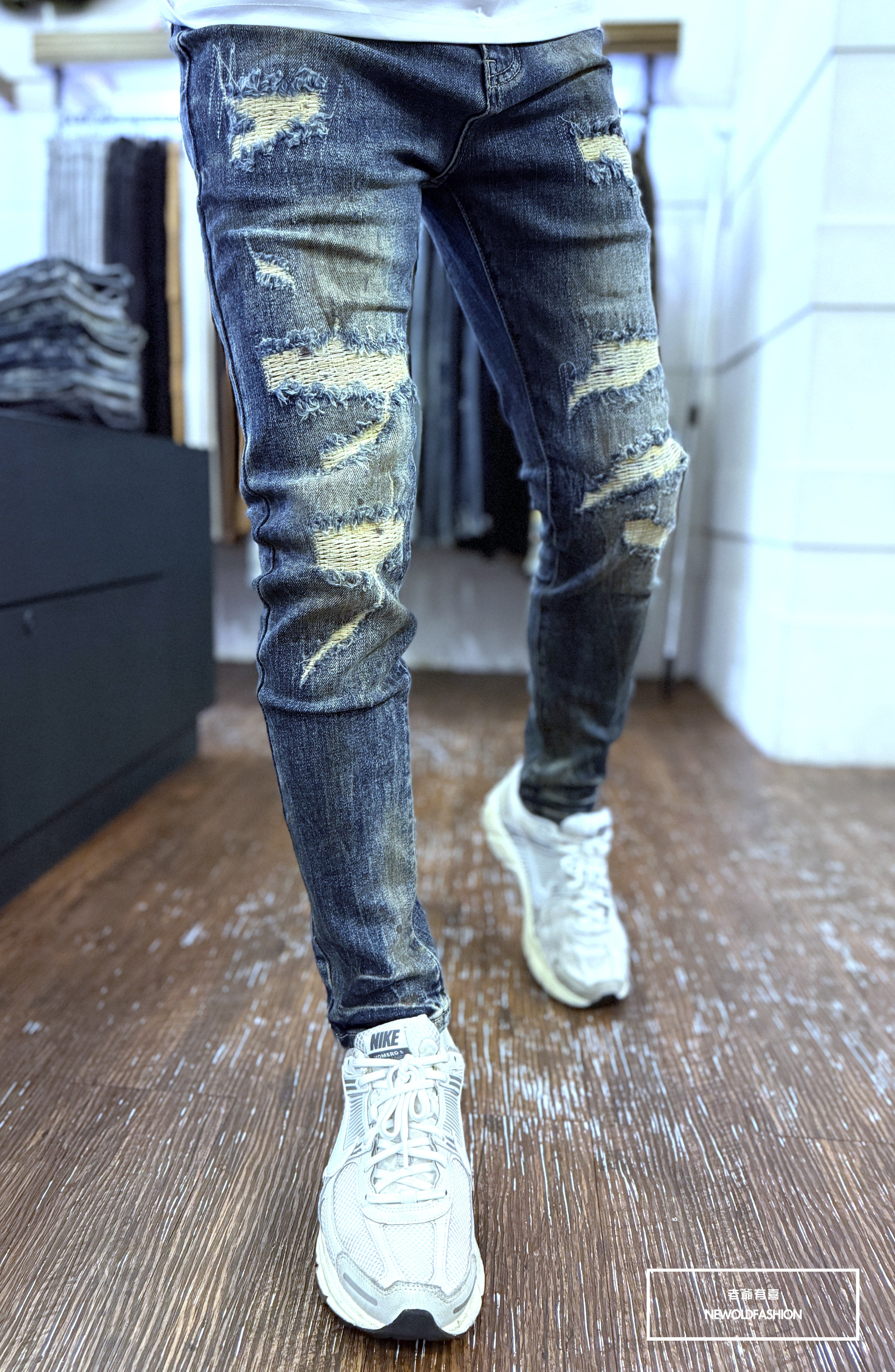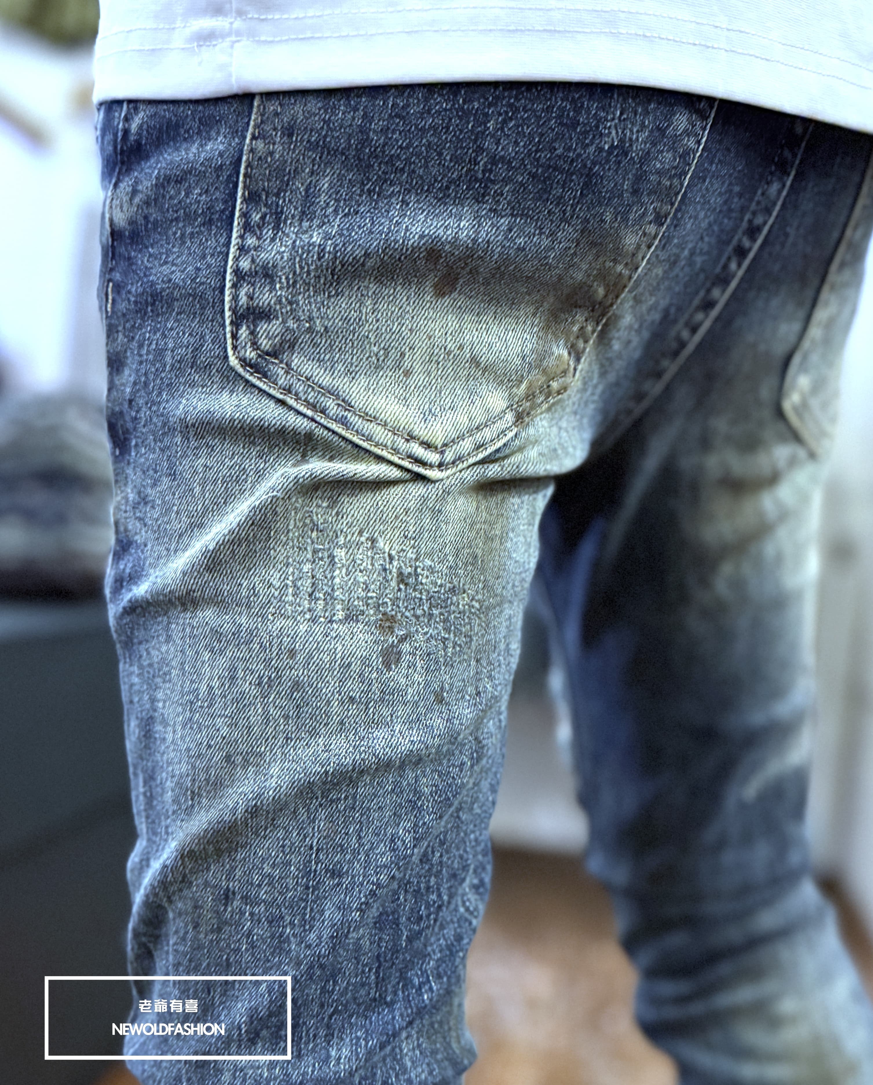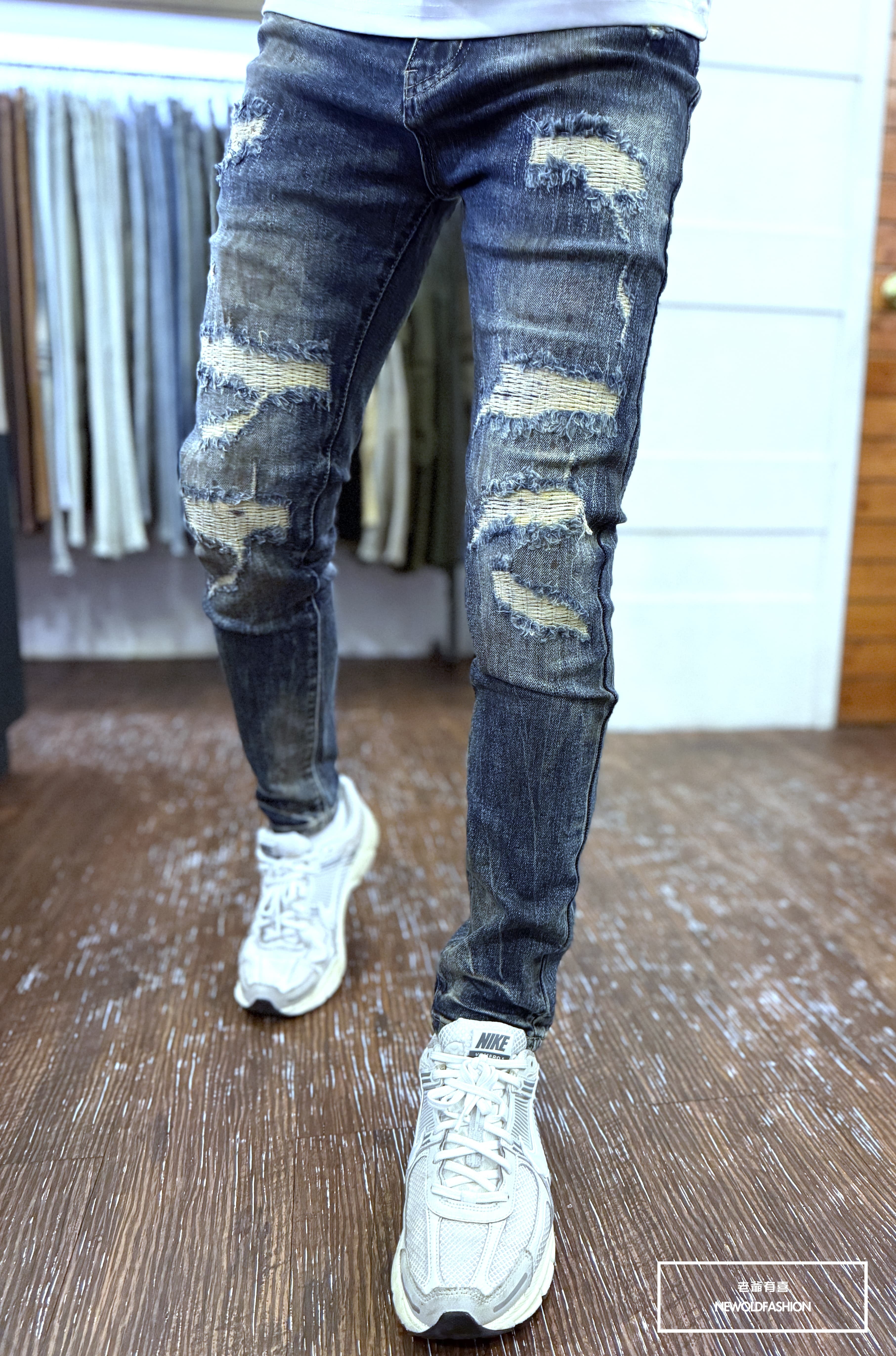 仿舊刷痕、大面積破壞車縫補丁造型設計!