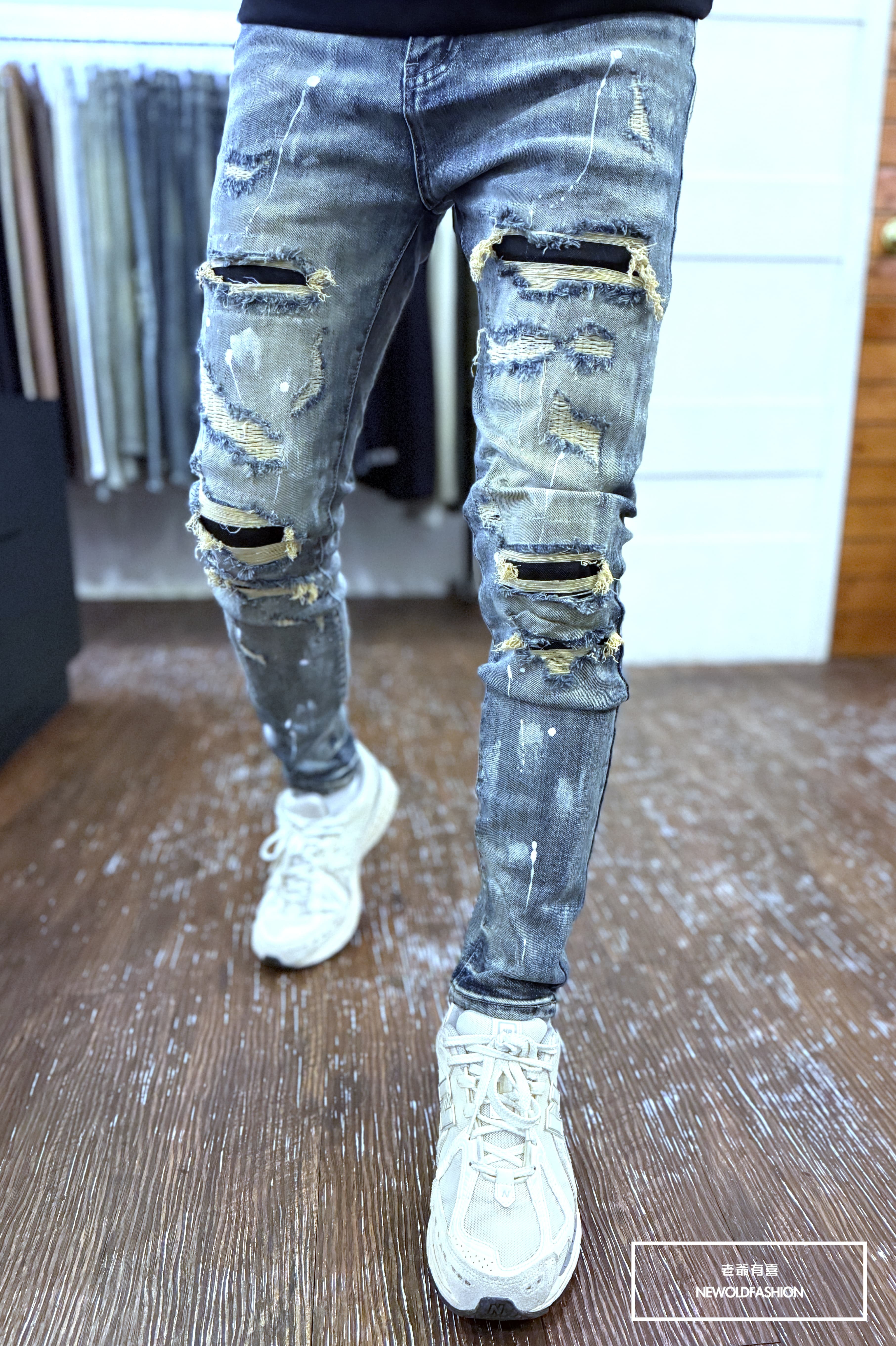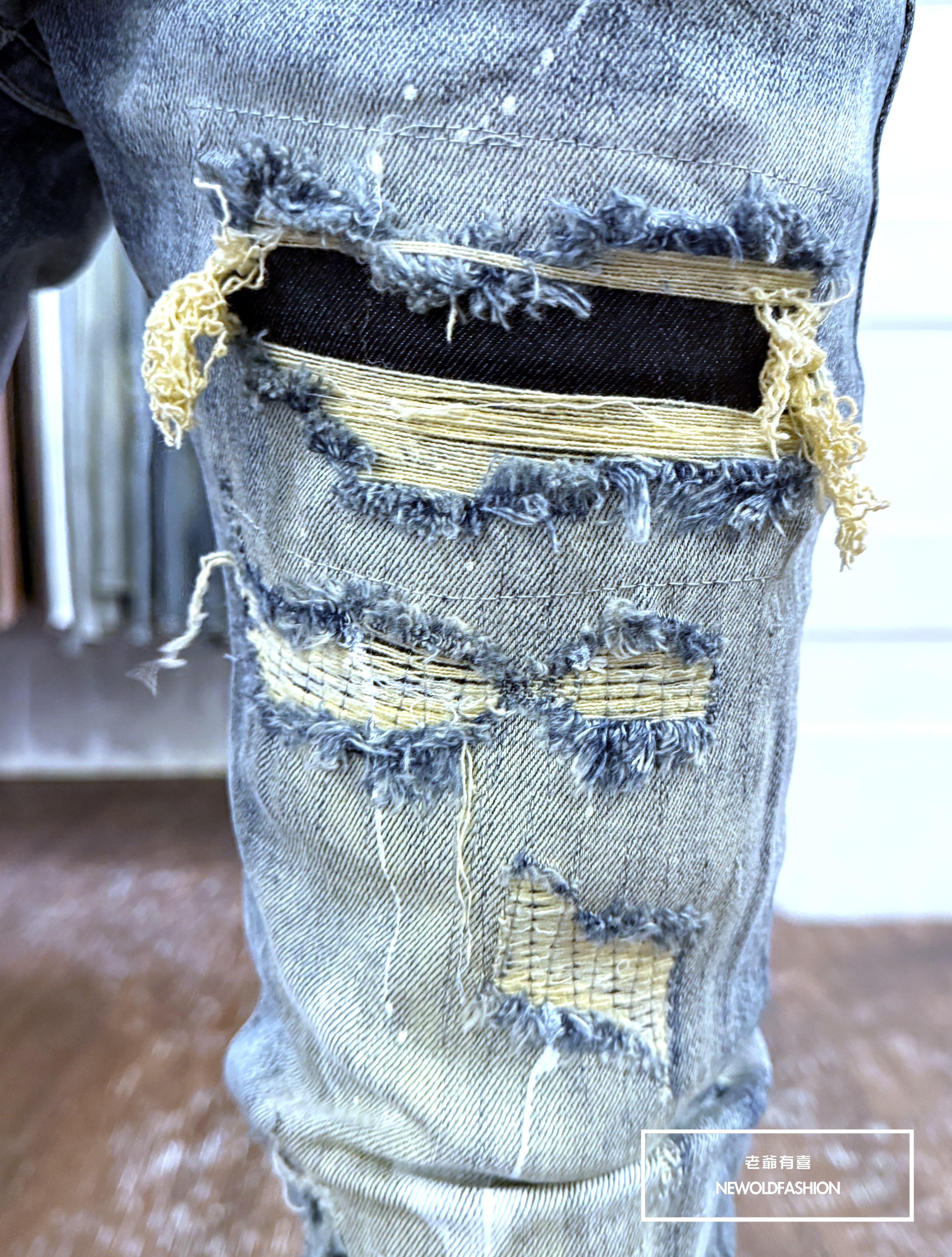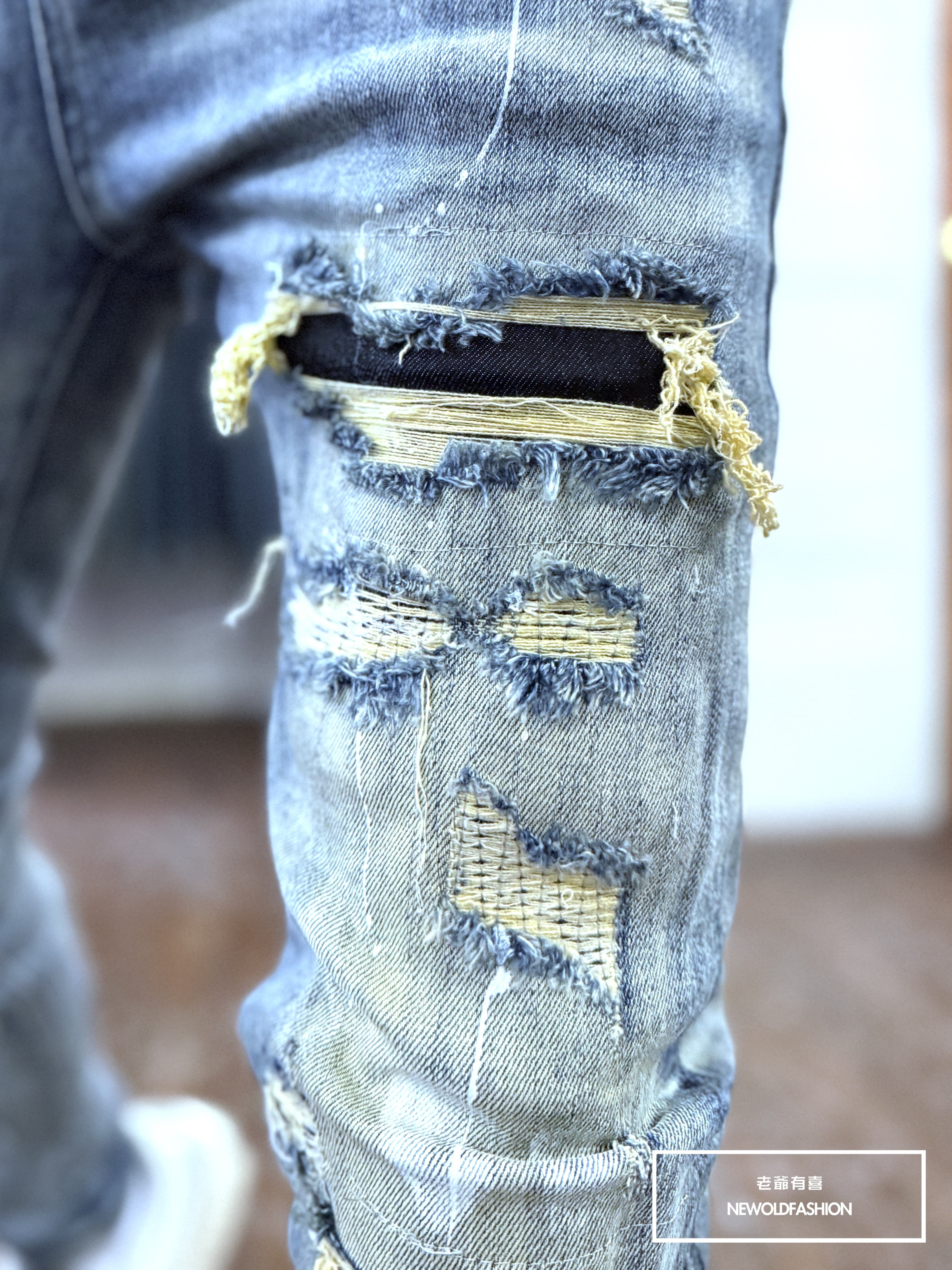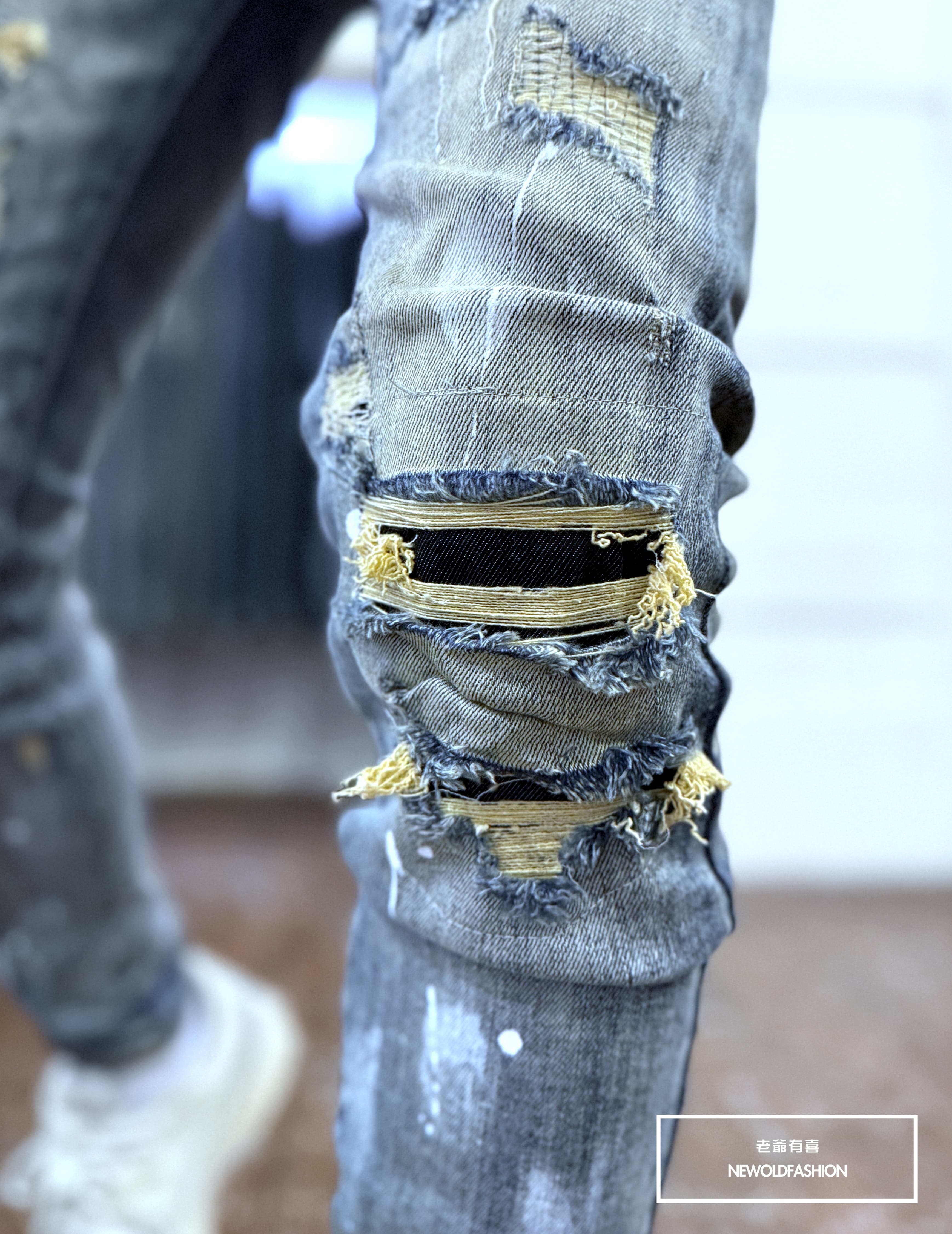 大面積潑漆刷痕、多重破壞車縫補丁造型設計