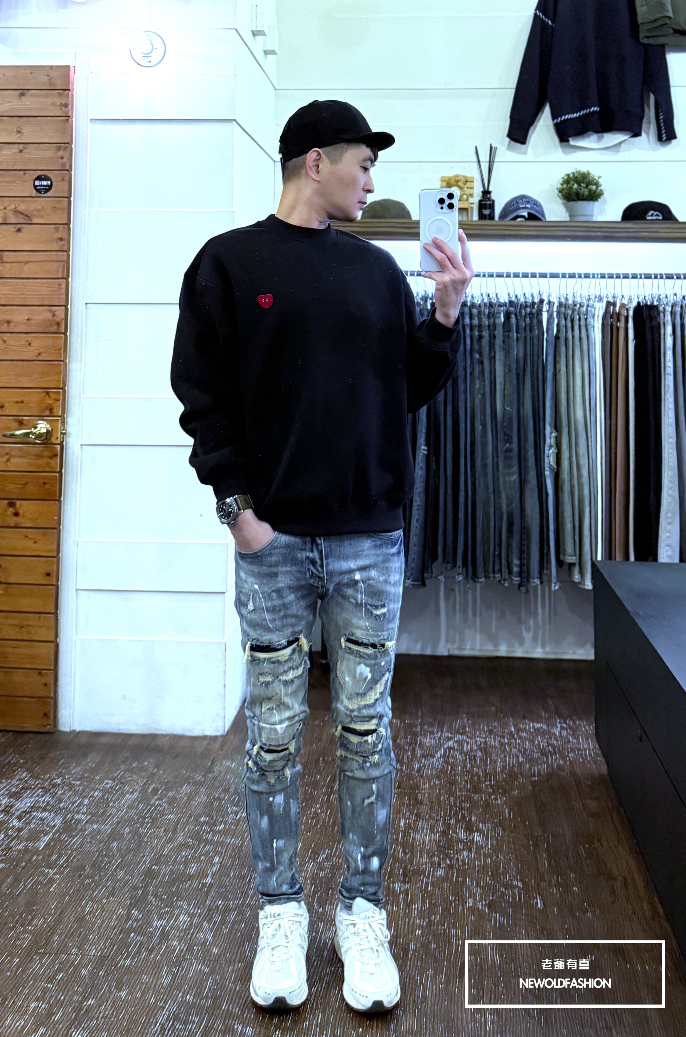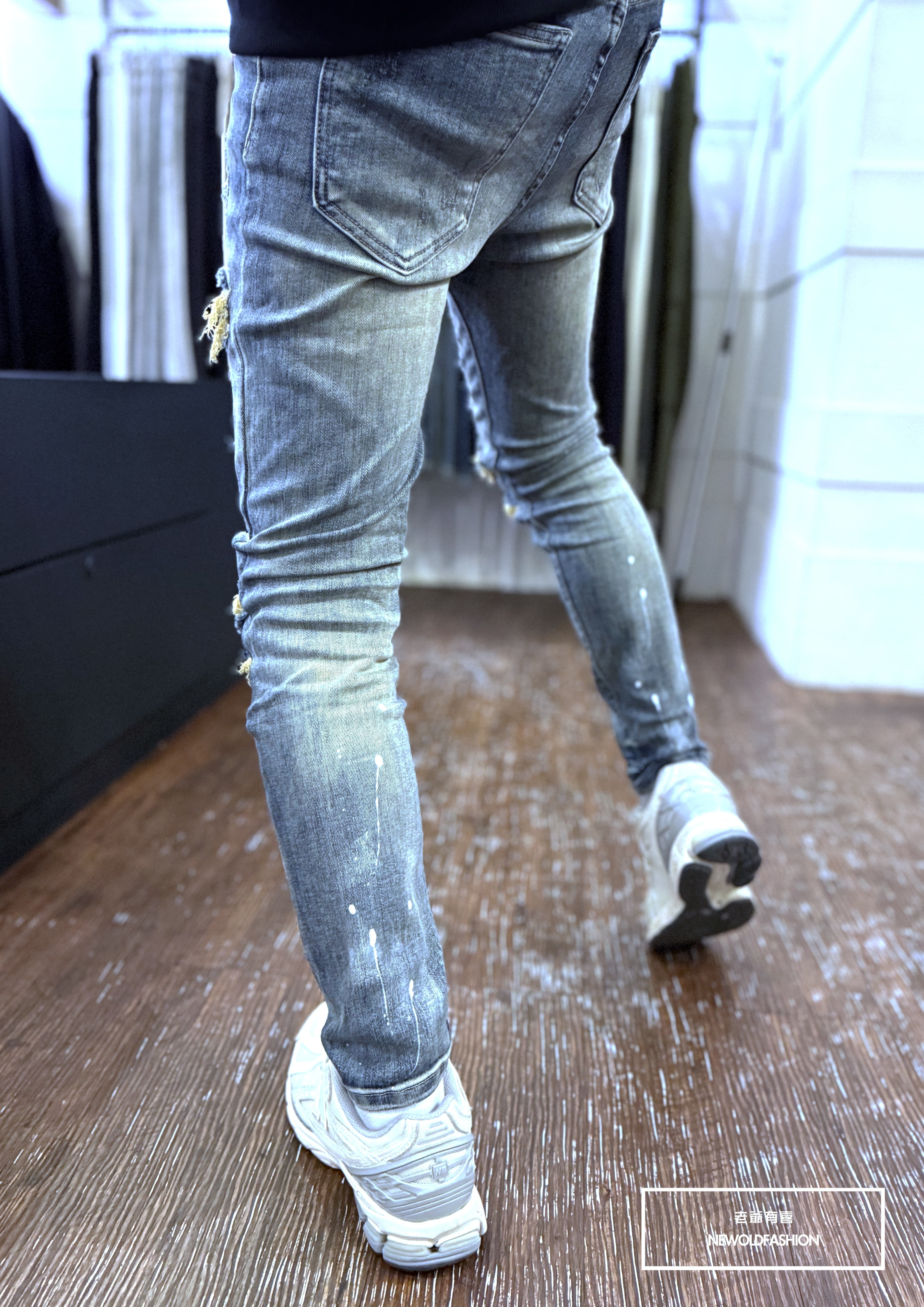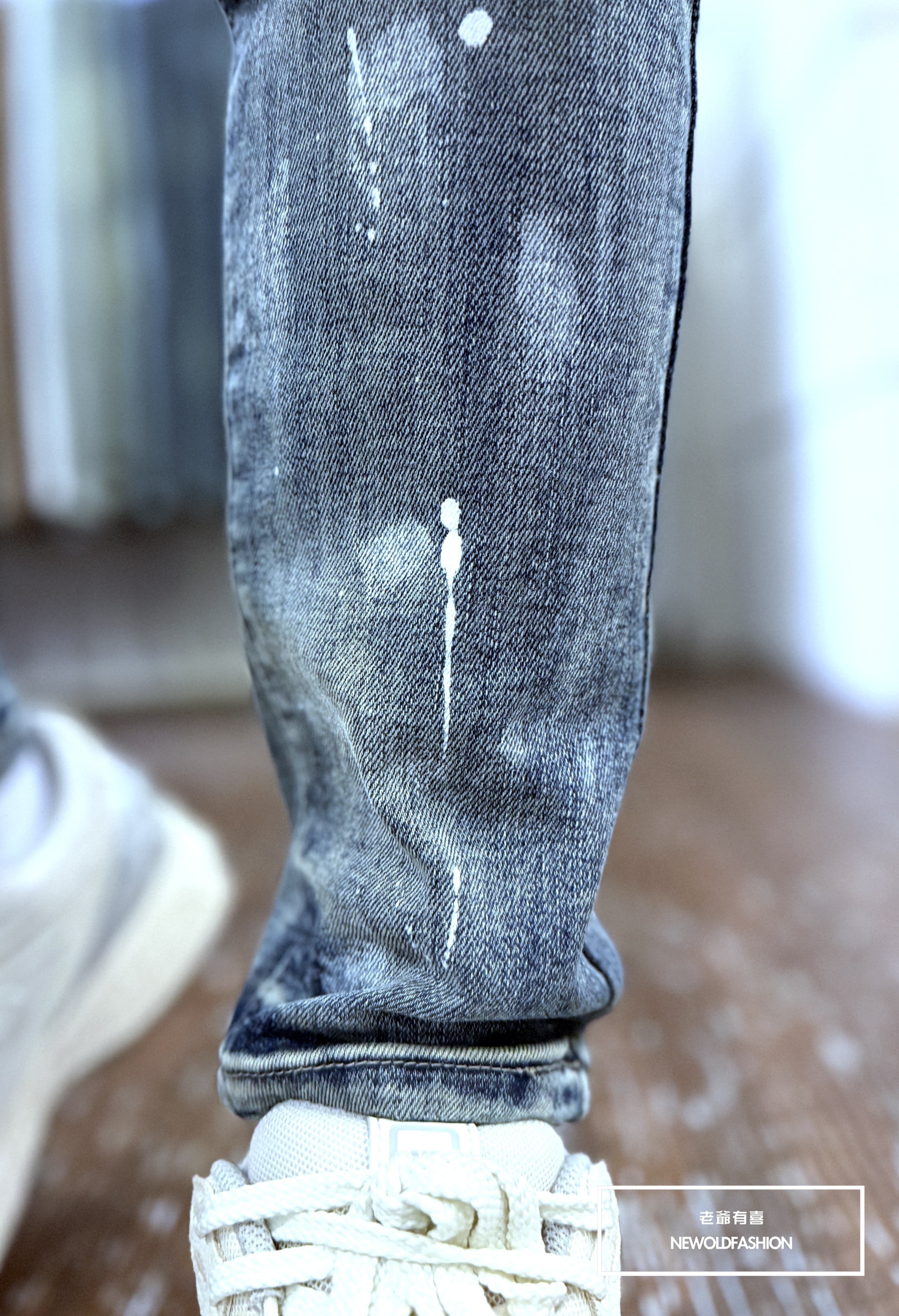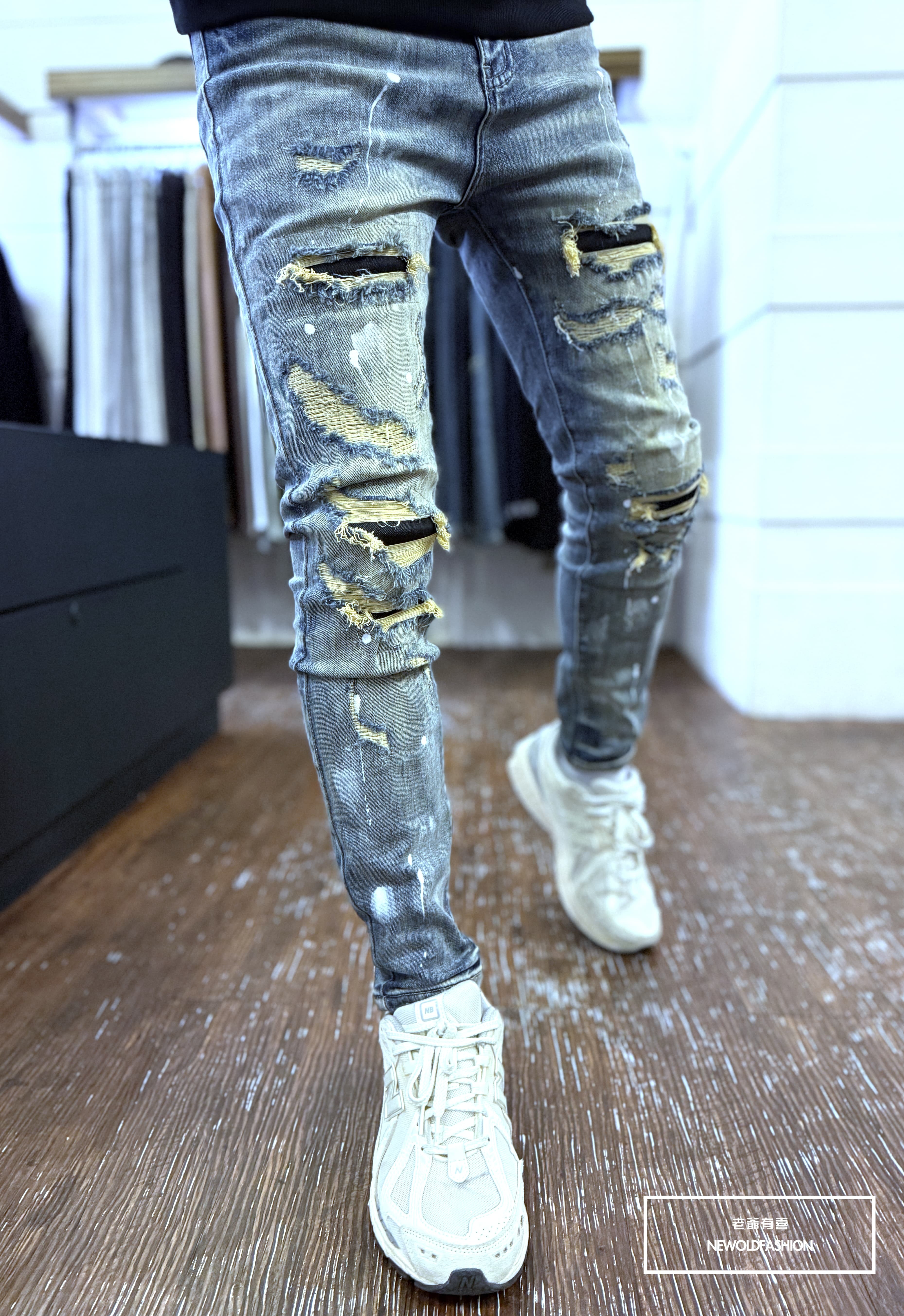 大面積潑漆刷痕、多重破壞車縫補丁造型設計