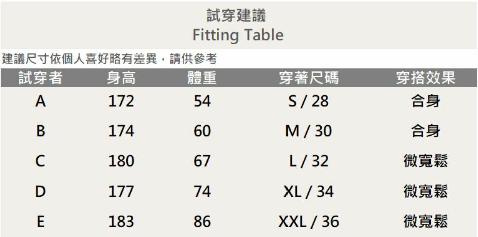 五個尺寸(S、M、L、XL、XXL)