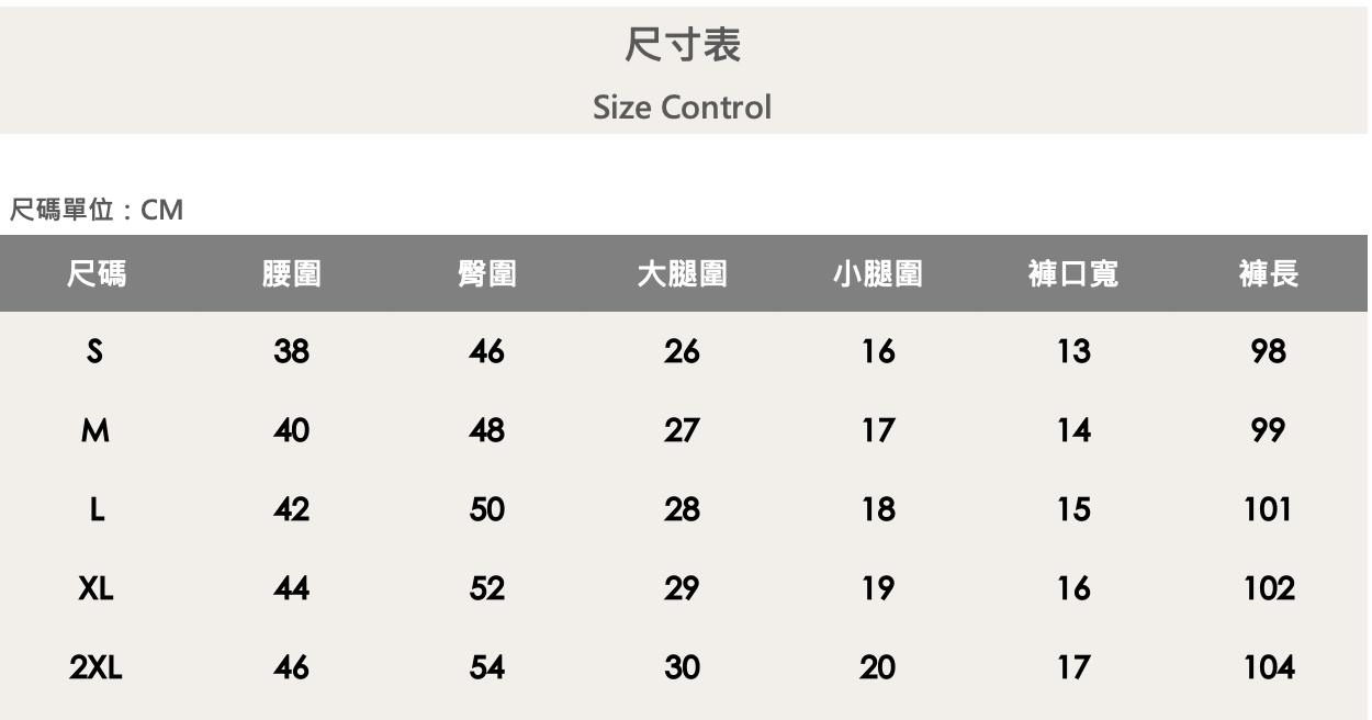 五個尺寸(S、M、L、XL、XXL)