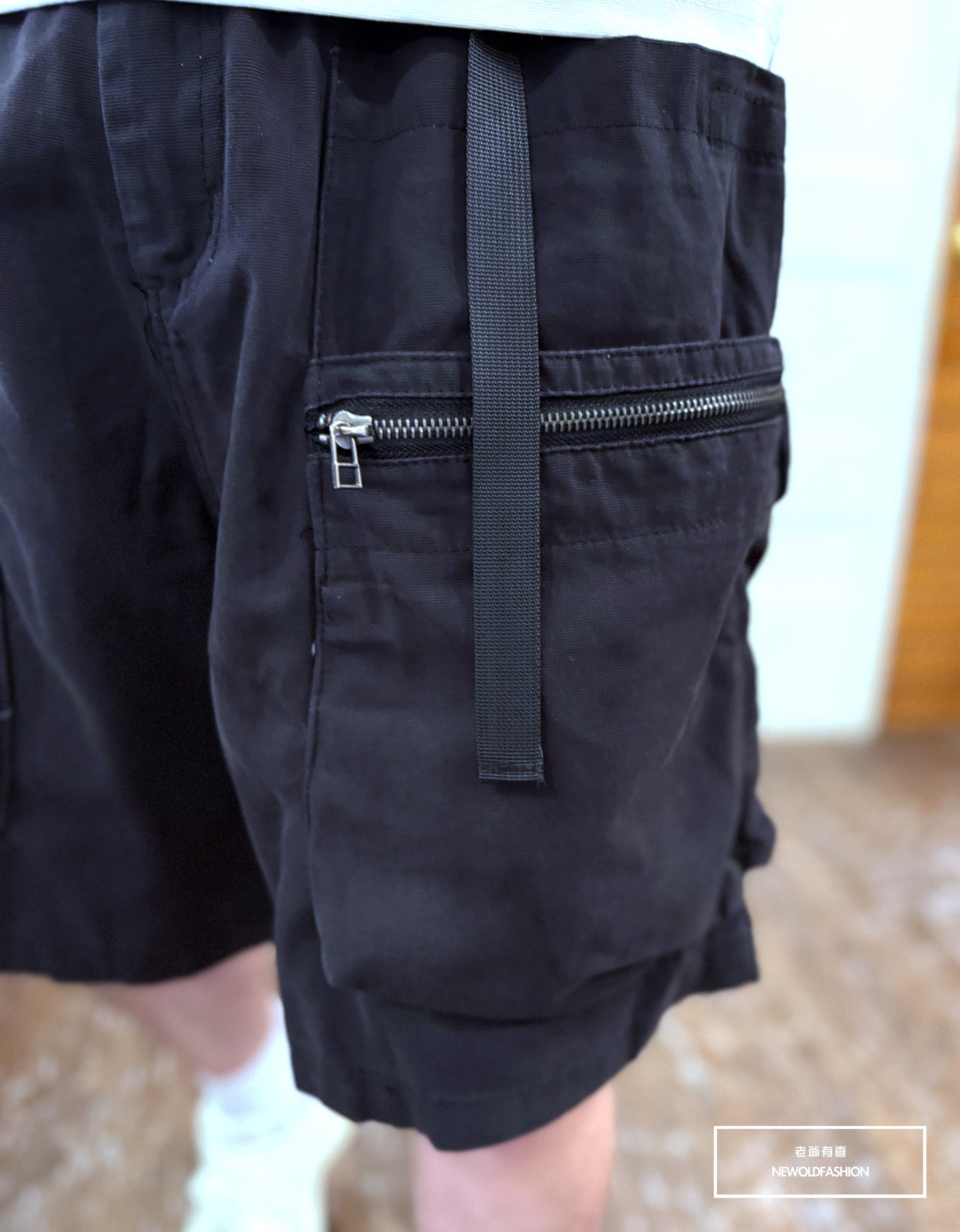 雙側多層拉鍊口袋造型,褲頭扣環鬆緊設計,可自行調整大小