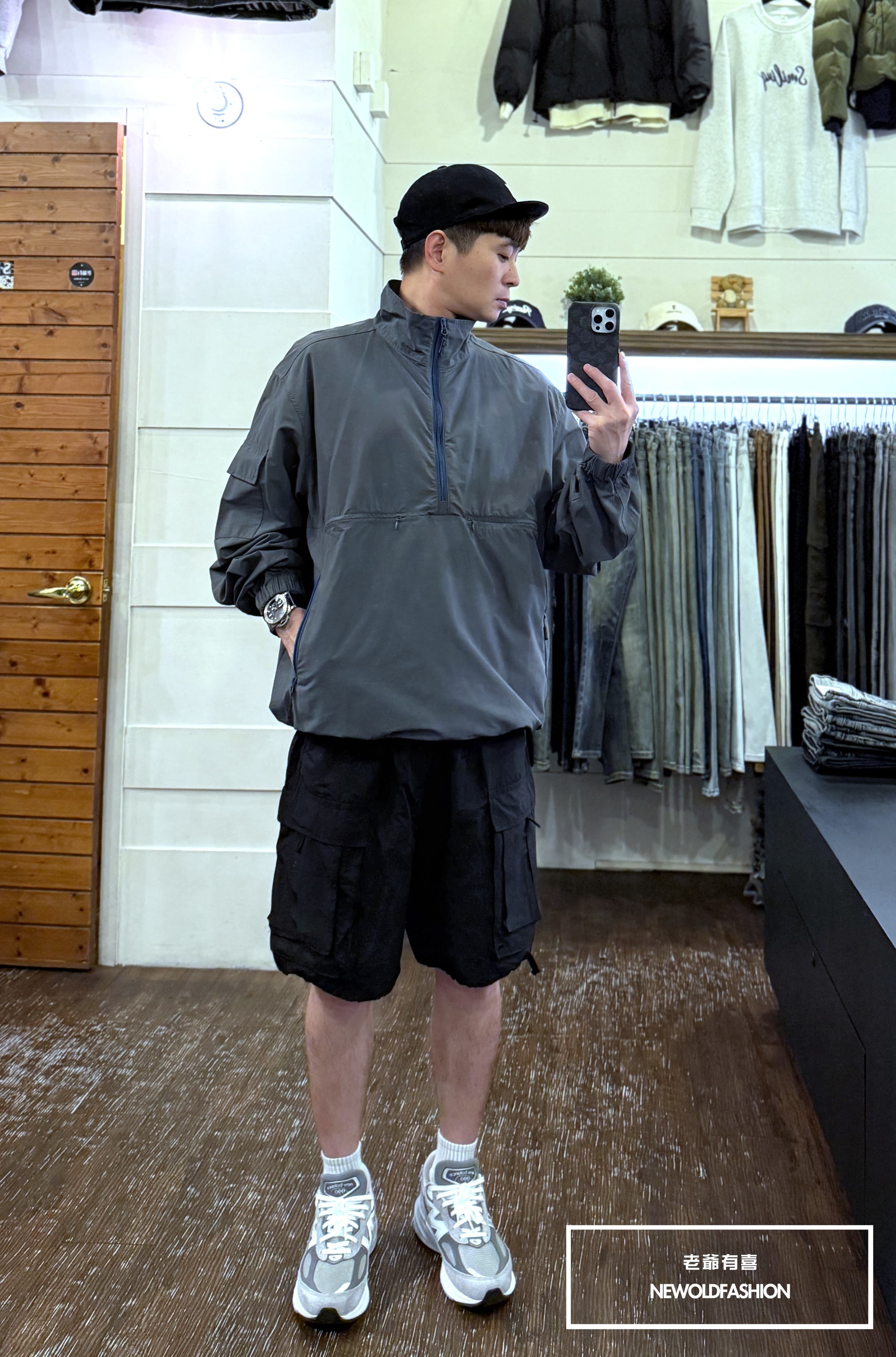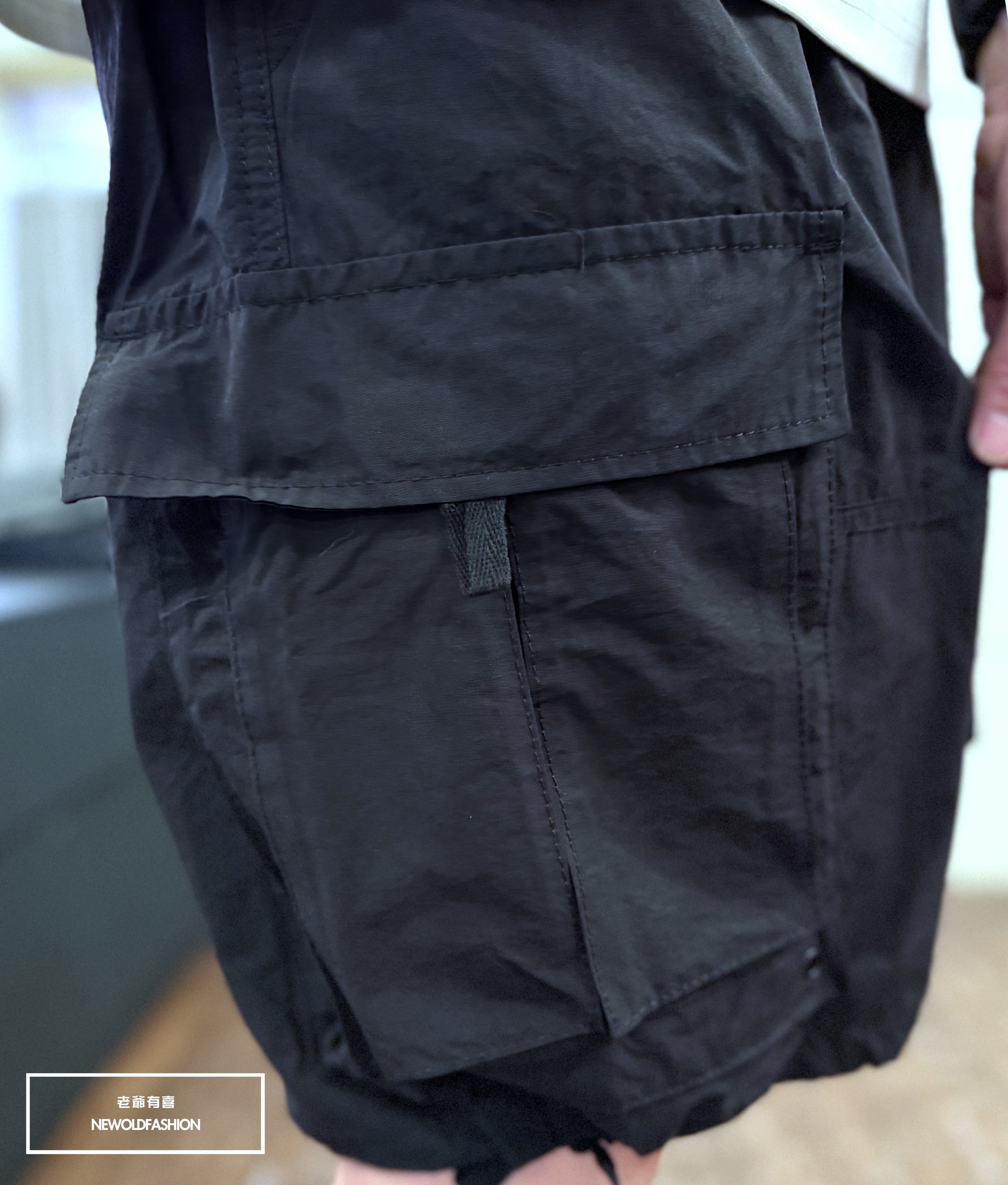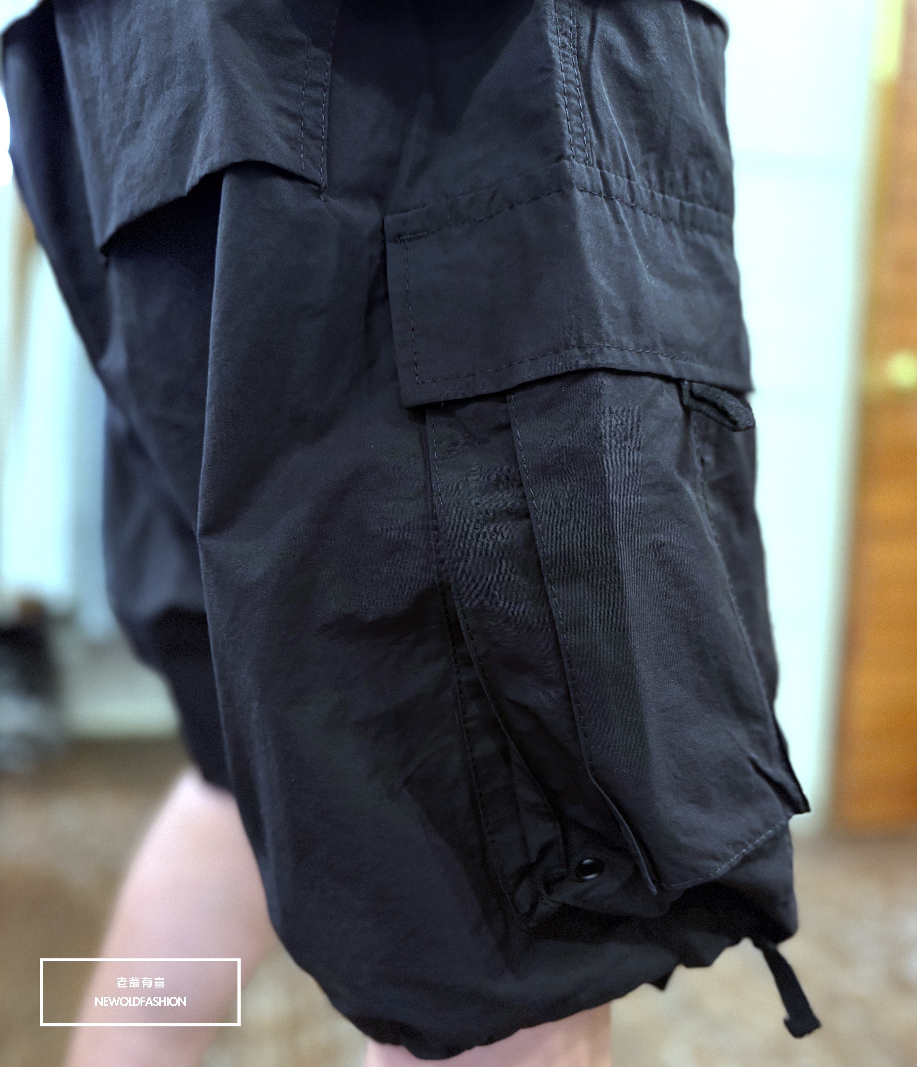 雙側不對稱雙層魔鬼氈口袋造型,褲頭、褲管抽繩設計可自行調整大小