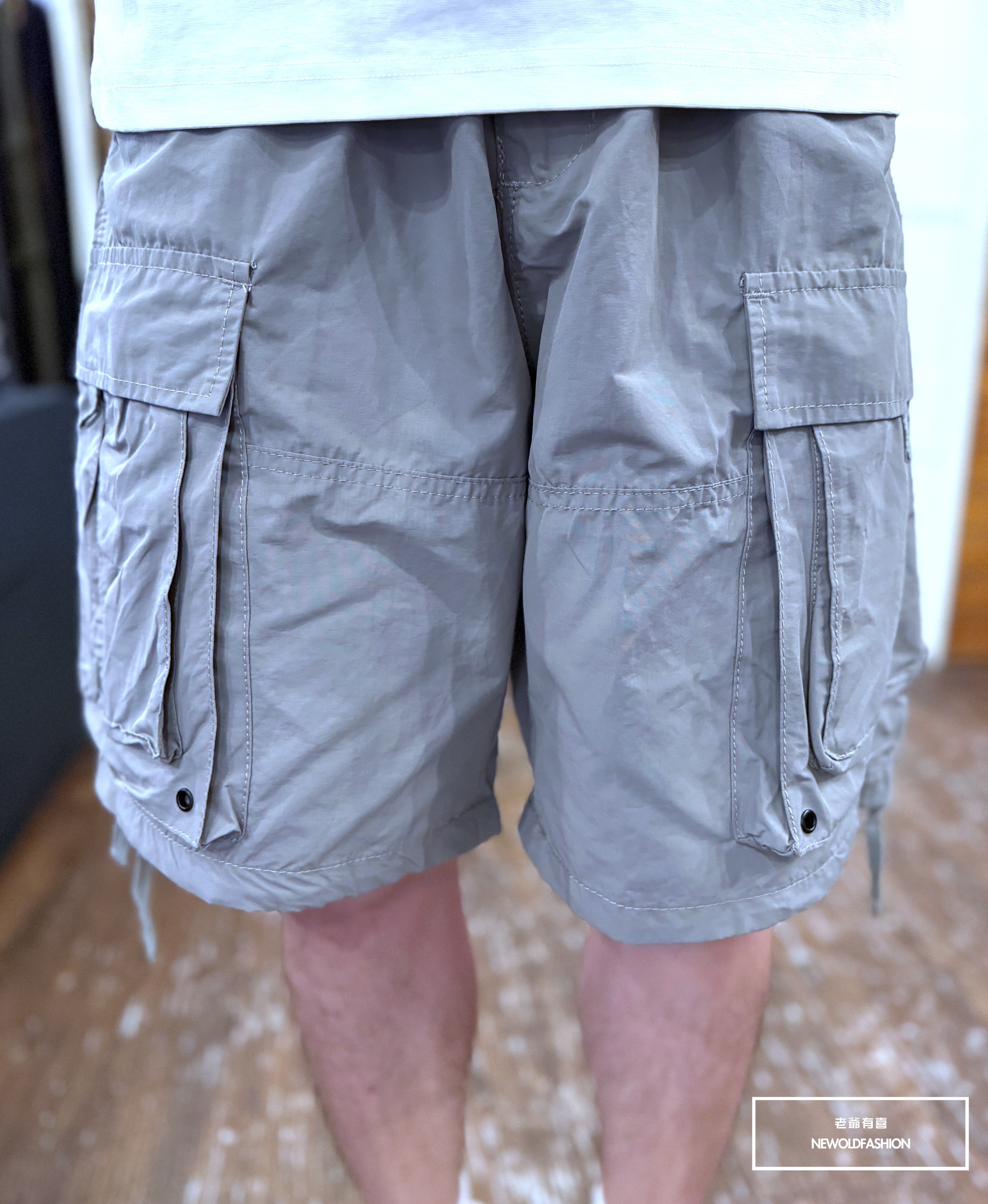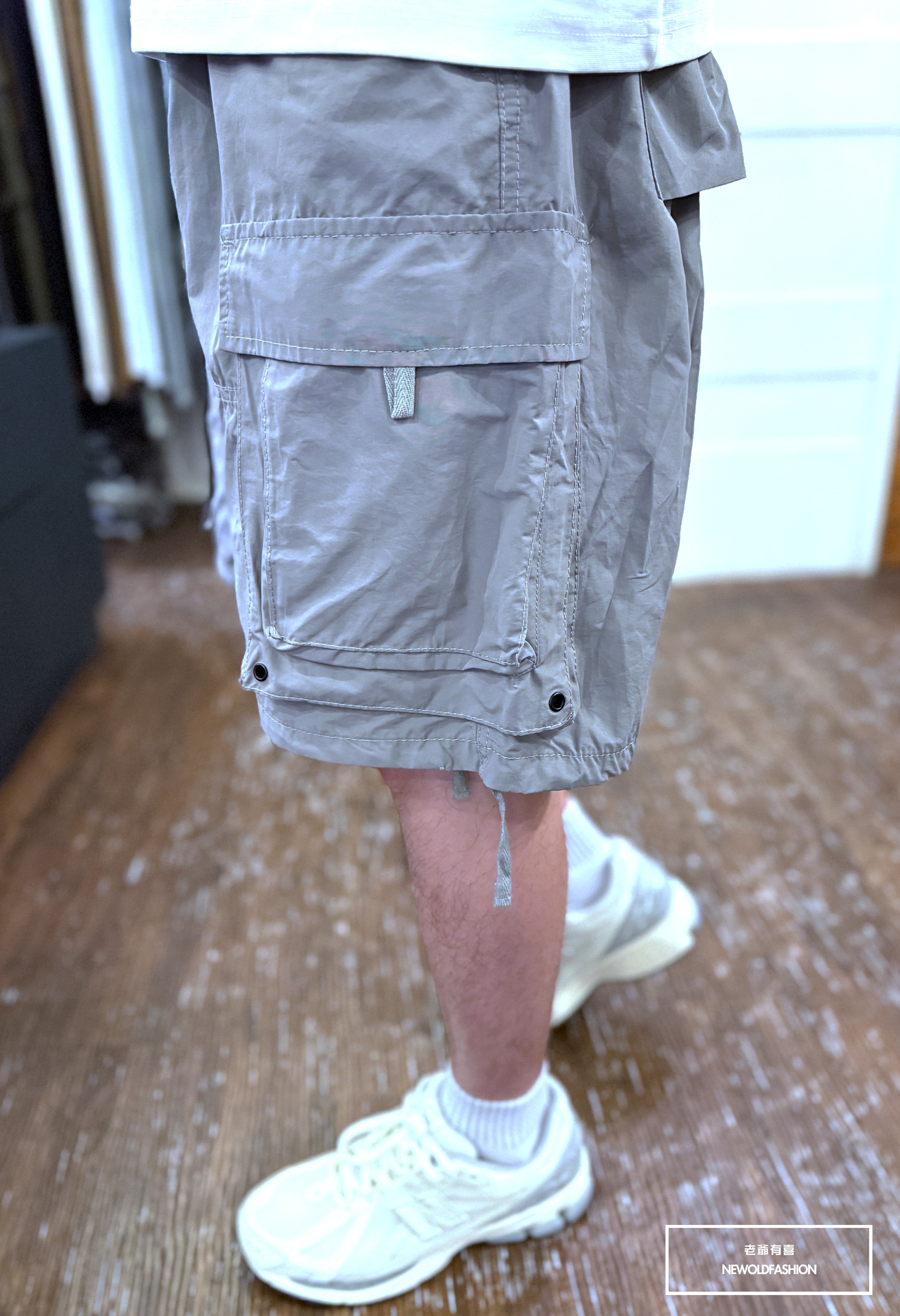 雙側不對稱雙層魔鬼氈口袋造型,褲頭、褲管抽繩設計可自行調整大小