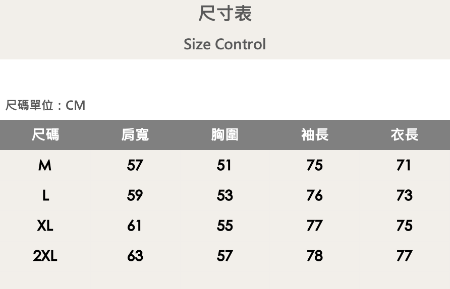 四個尺寸(M、L、XL、XXL)