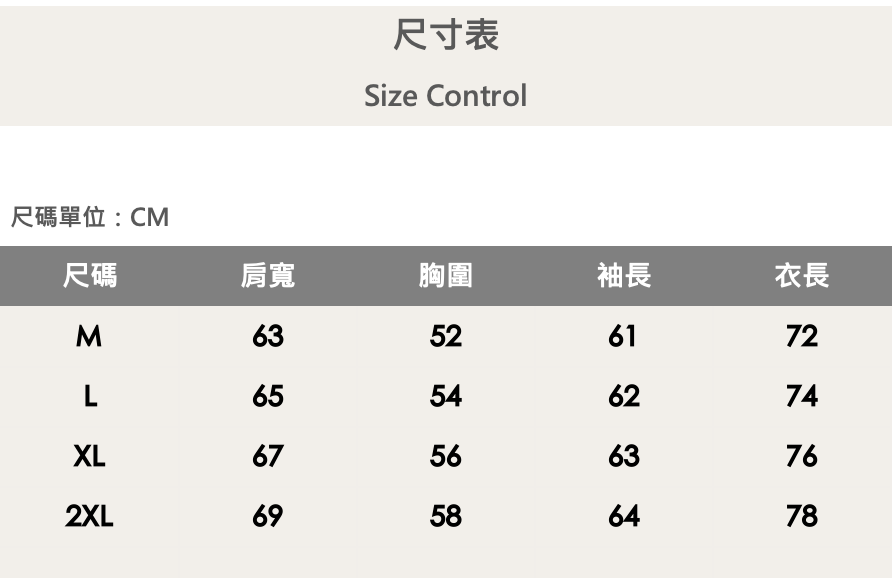 四個尺寸(M、L、XL、XXL)