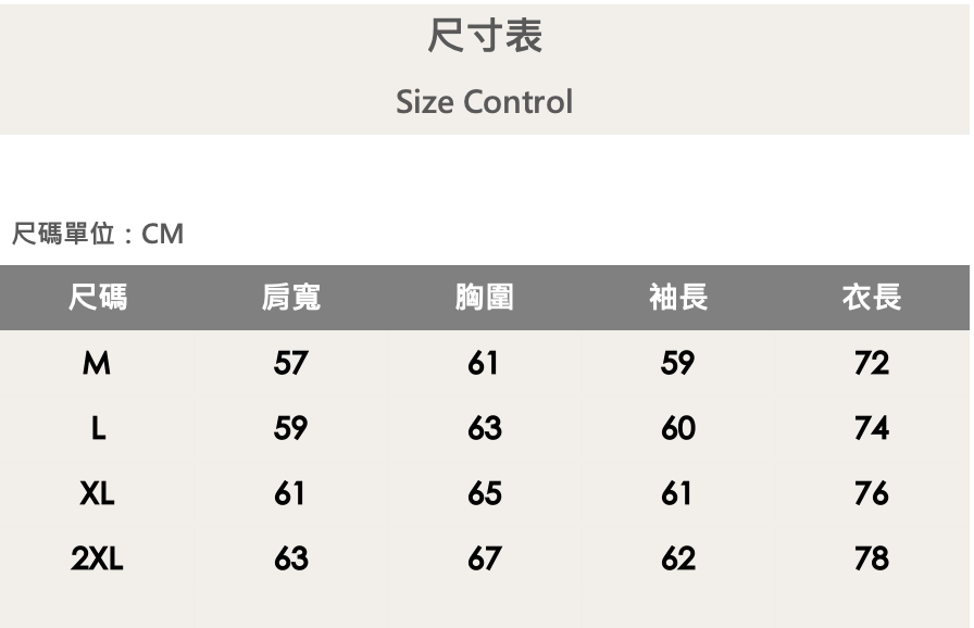 四個尺寸(M、L、XL、XXL)
