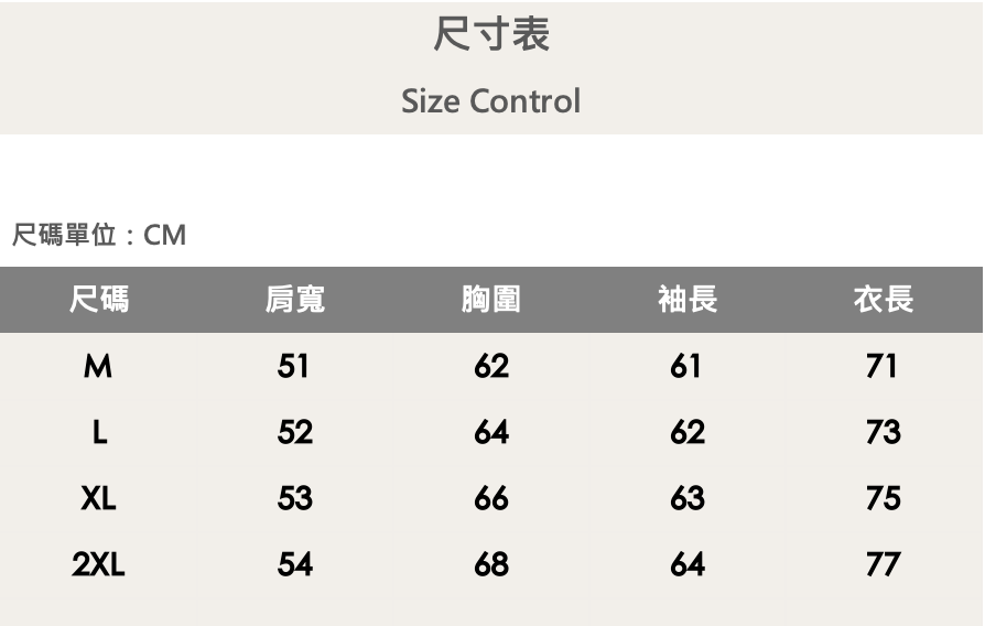 四個尺寸(M、L、XL、XXL)