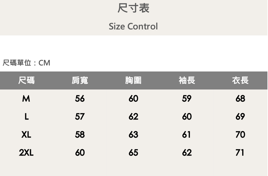 四個尺寸(M、L、XL、XXL)