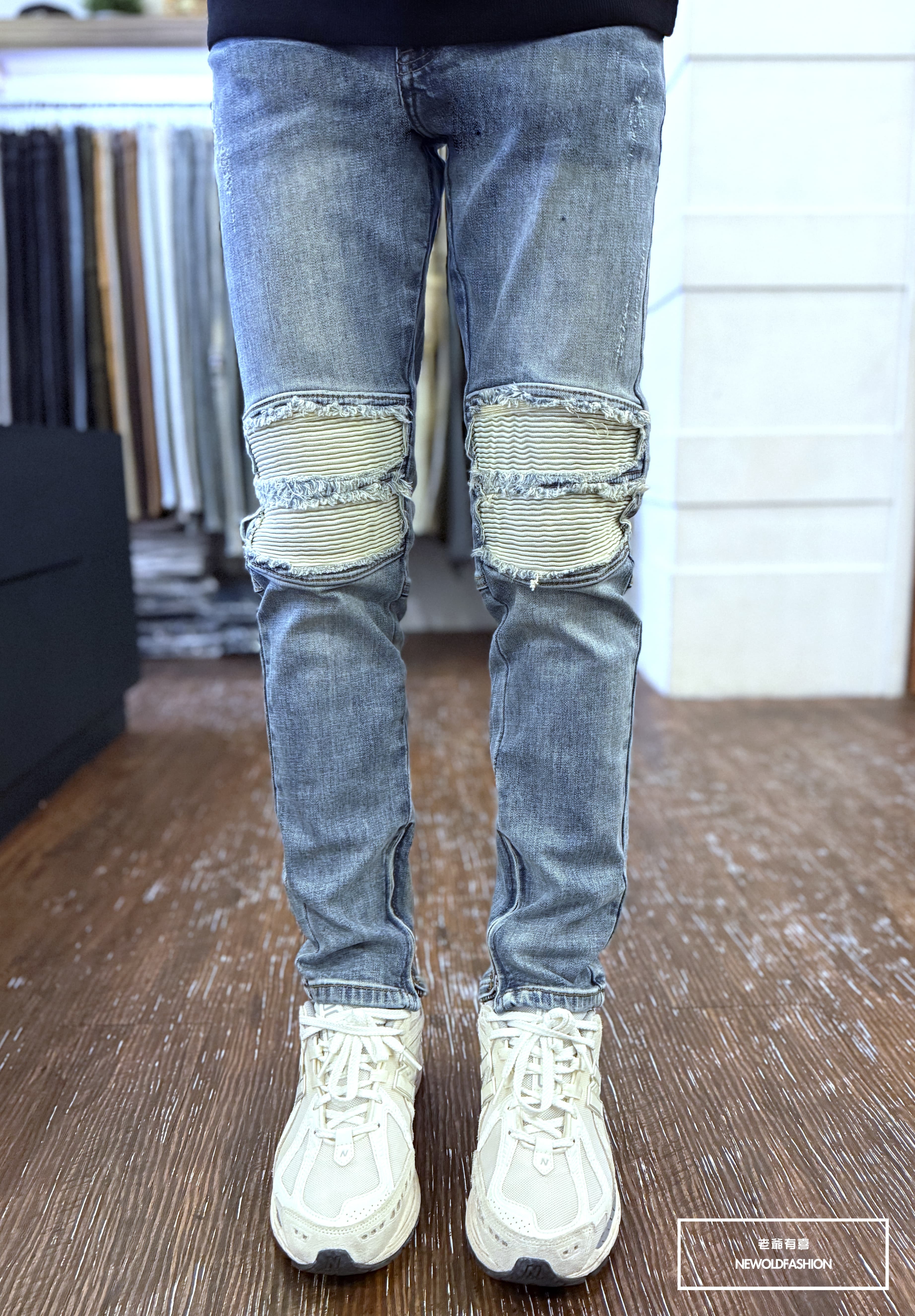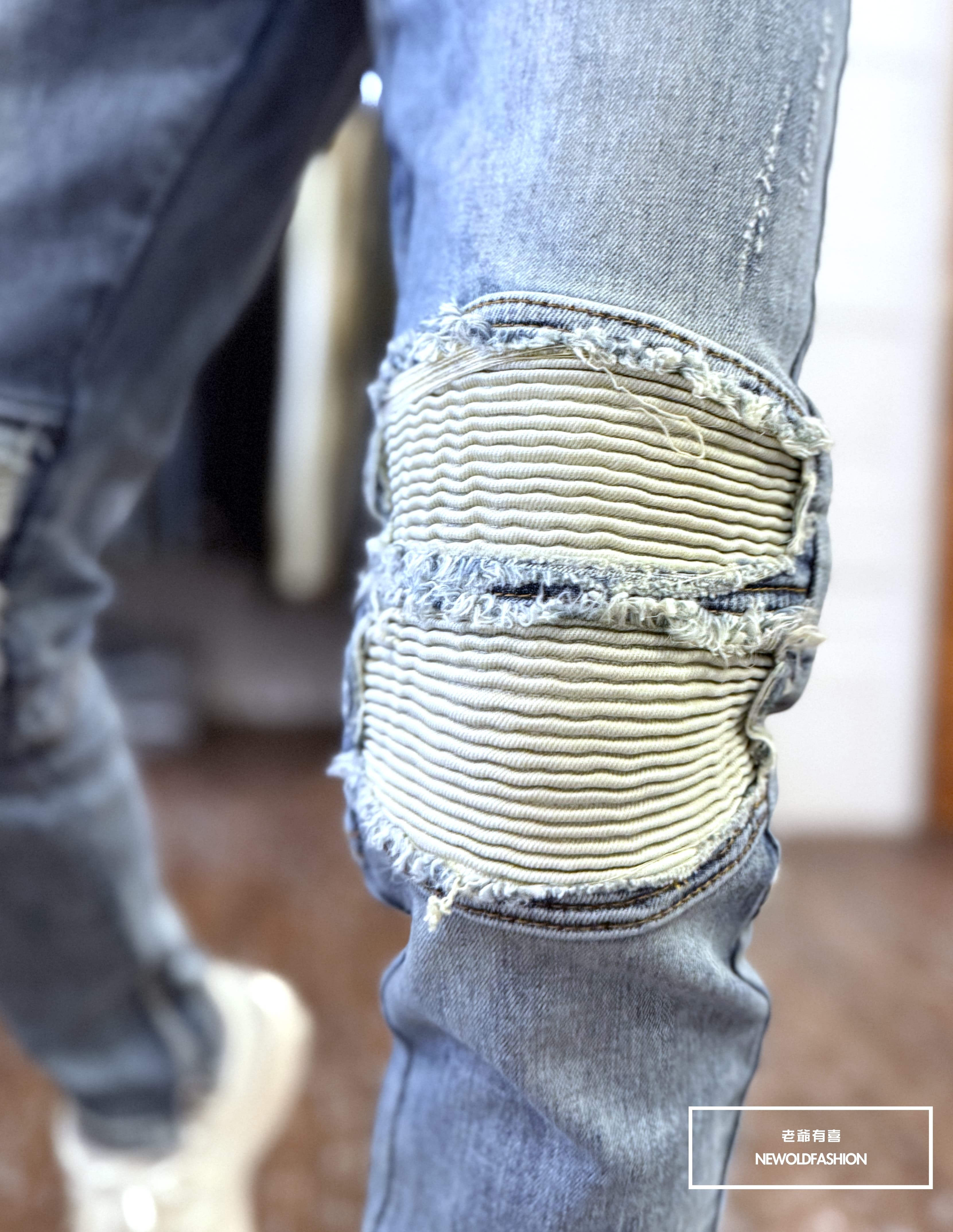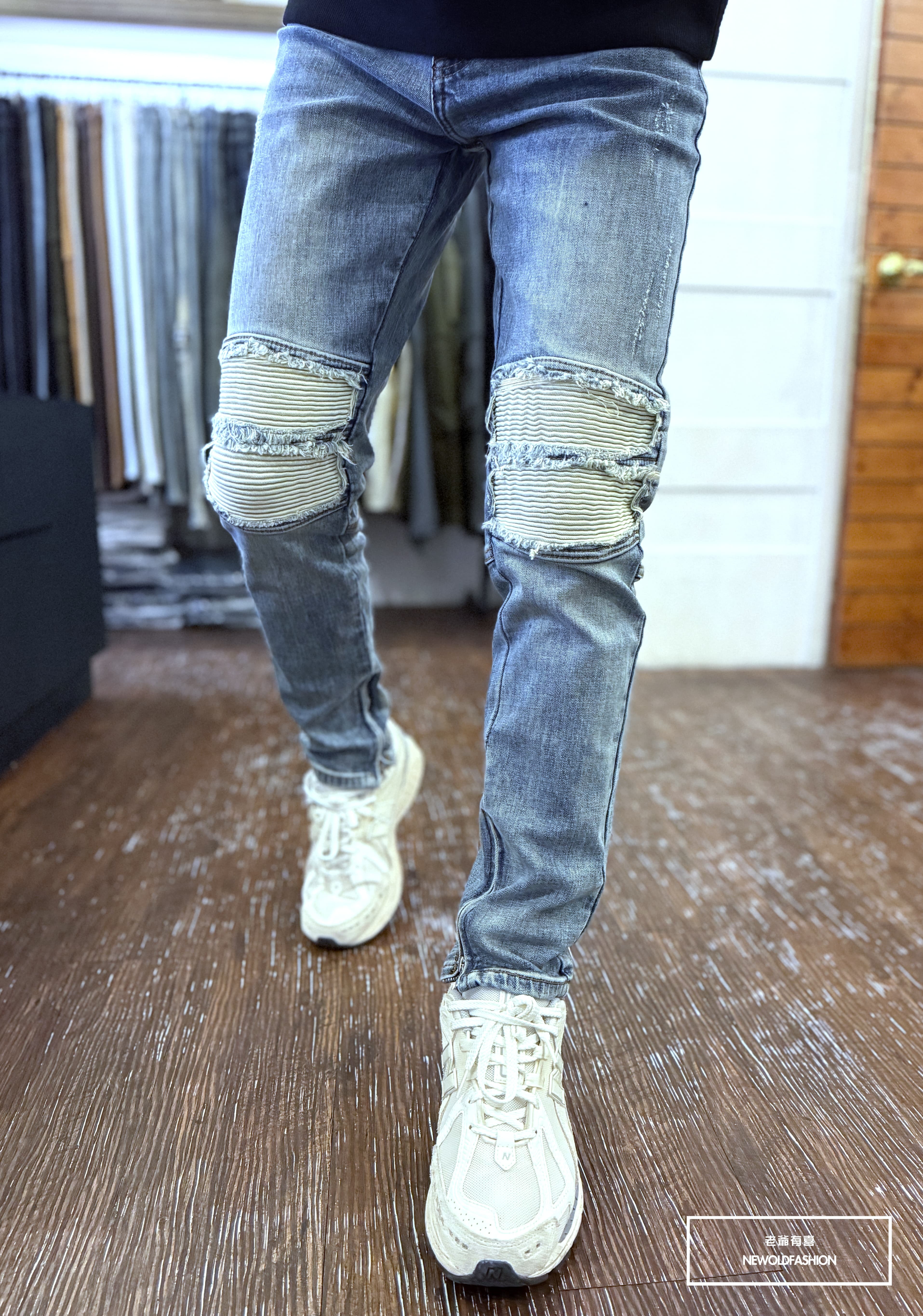 雙膝拼接白補丁,內側拉鍊造型設計