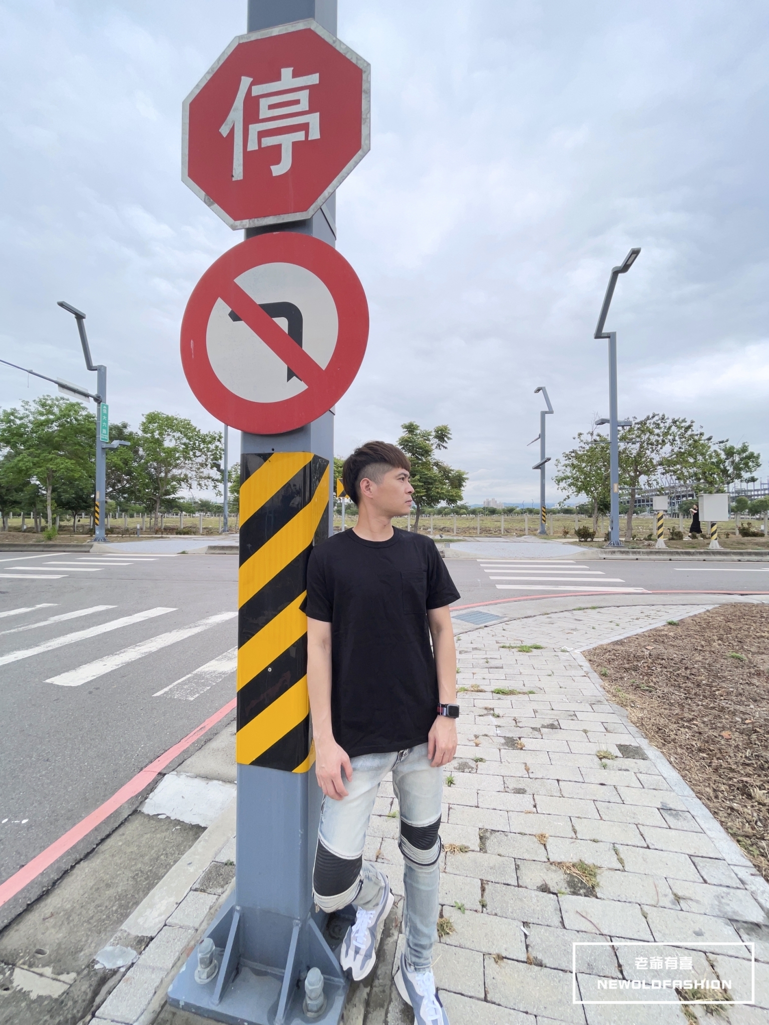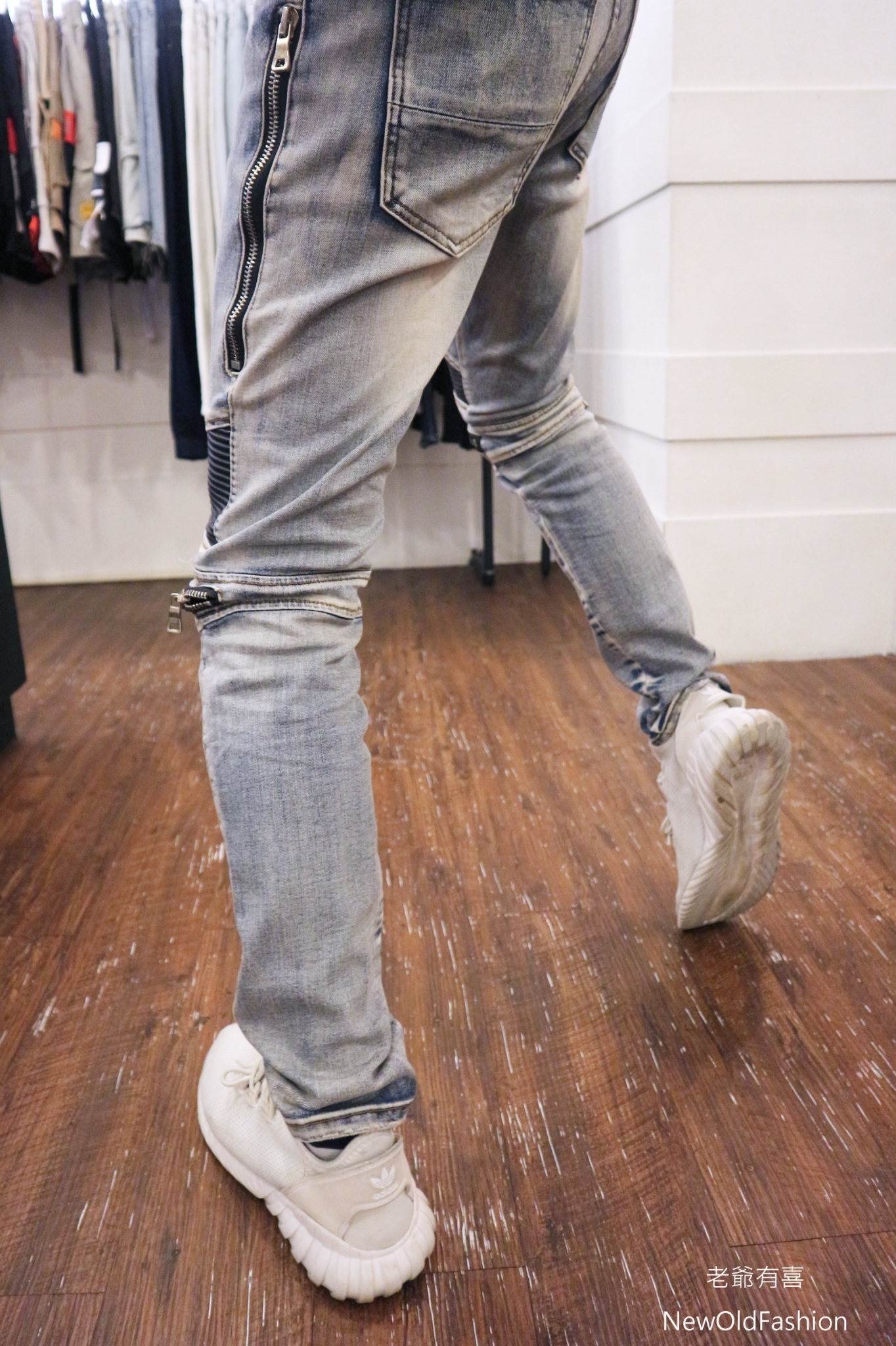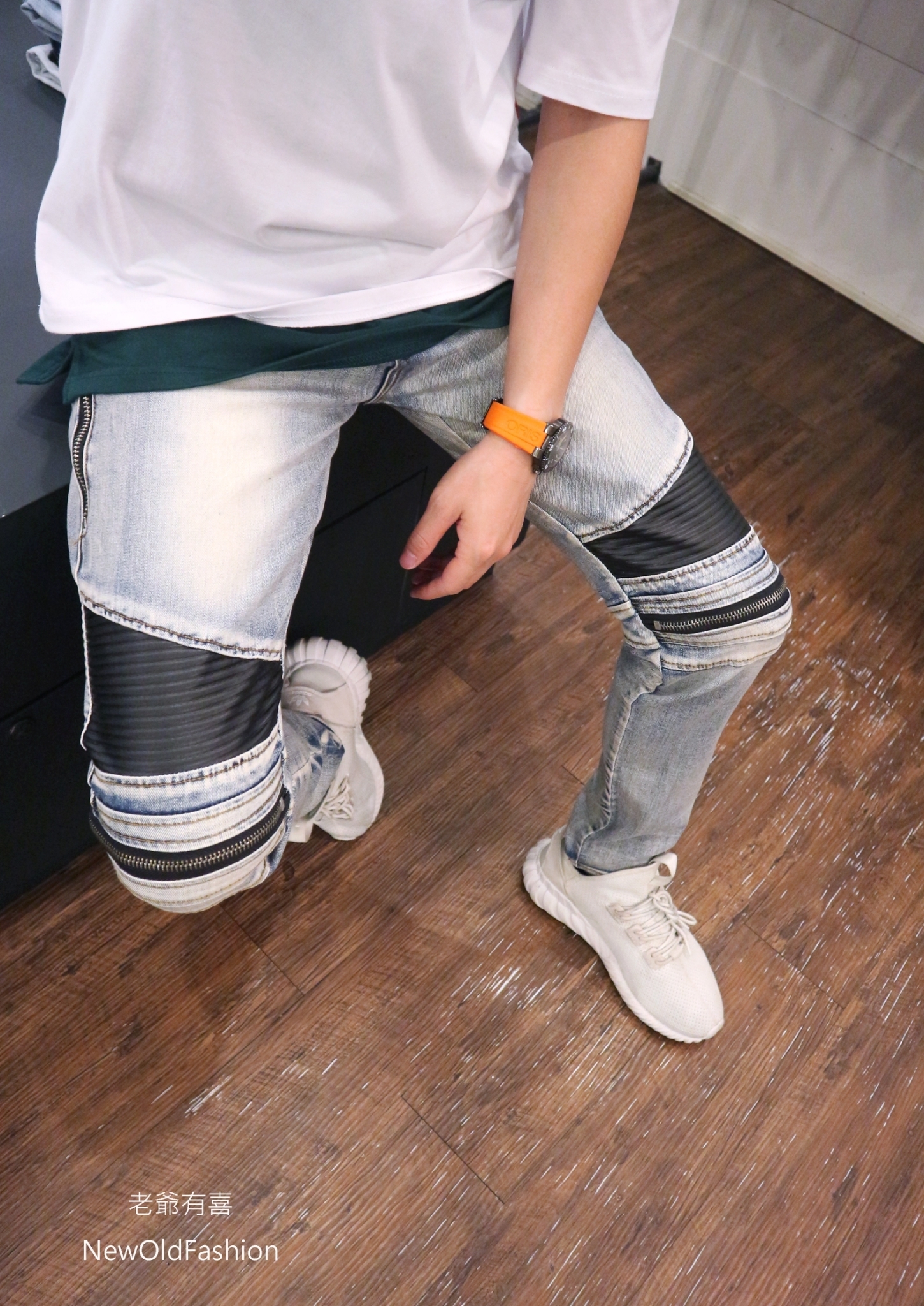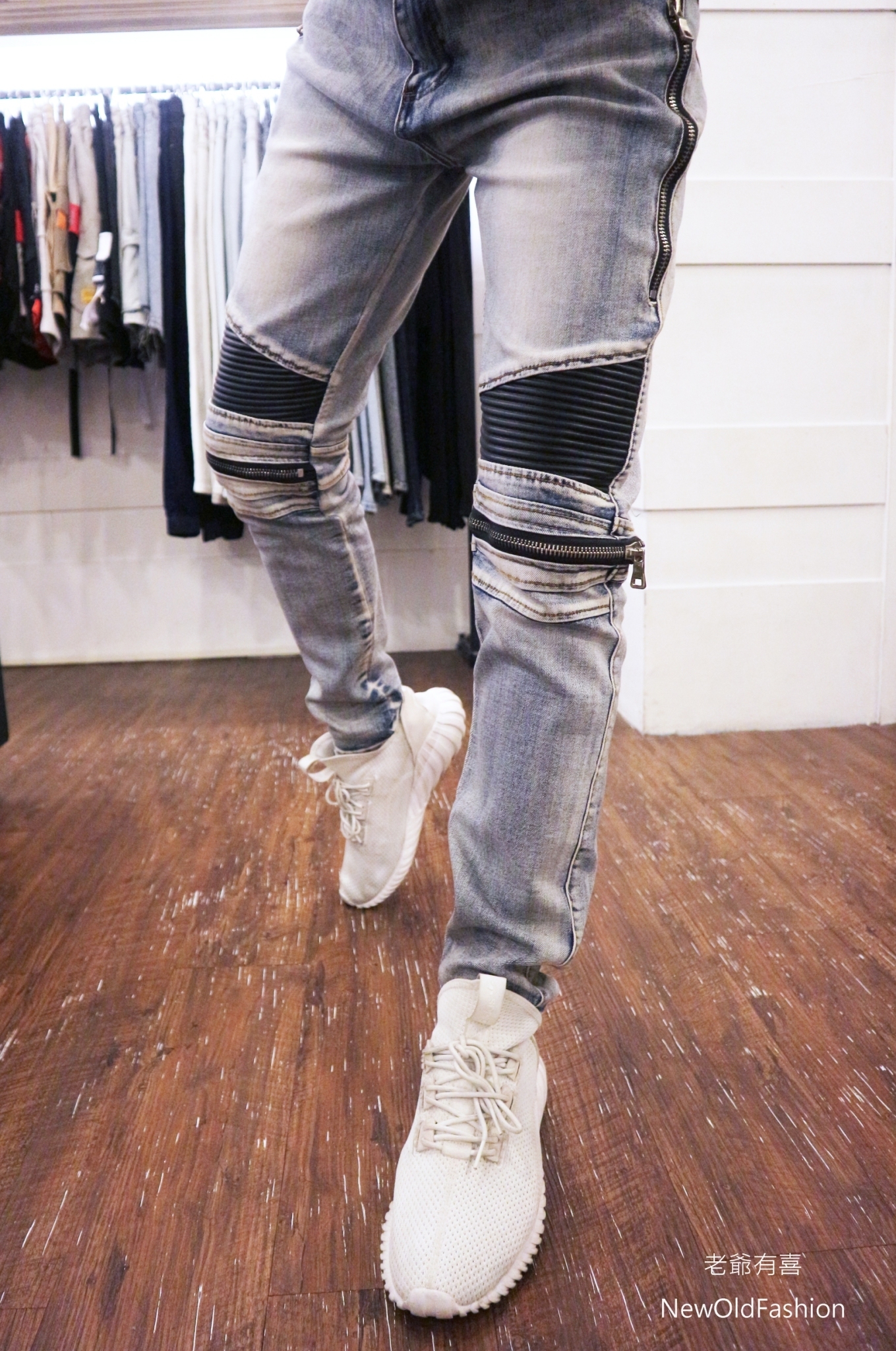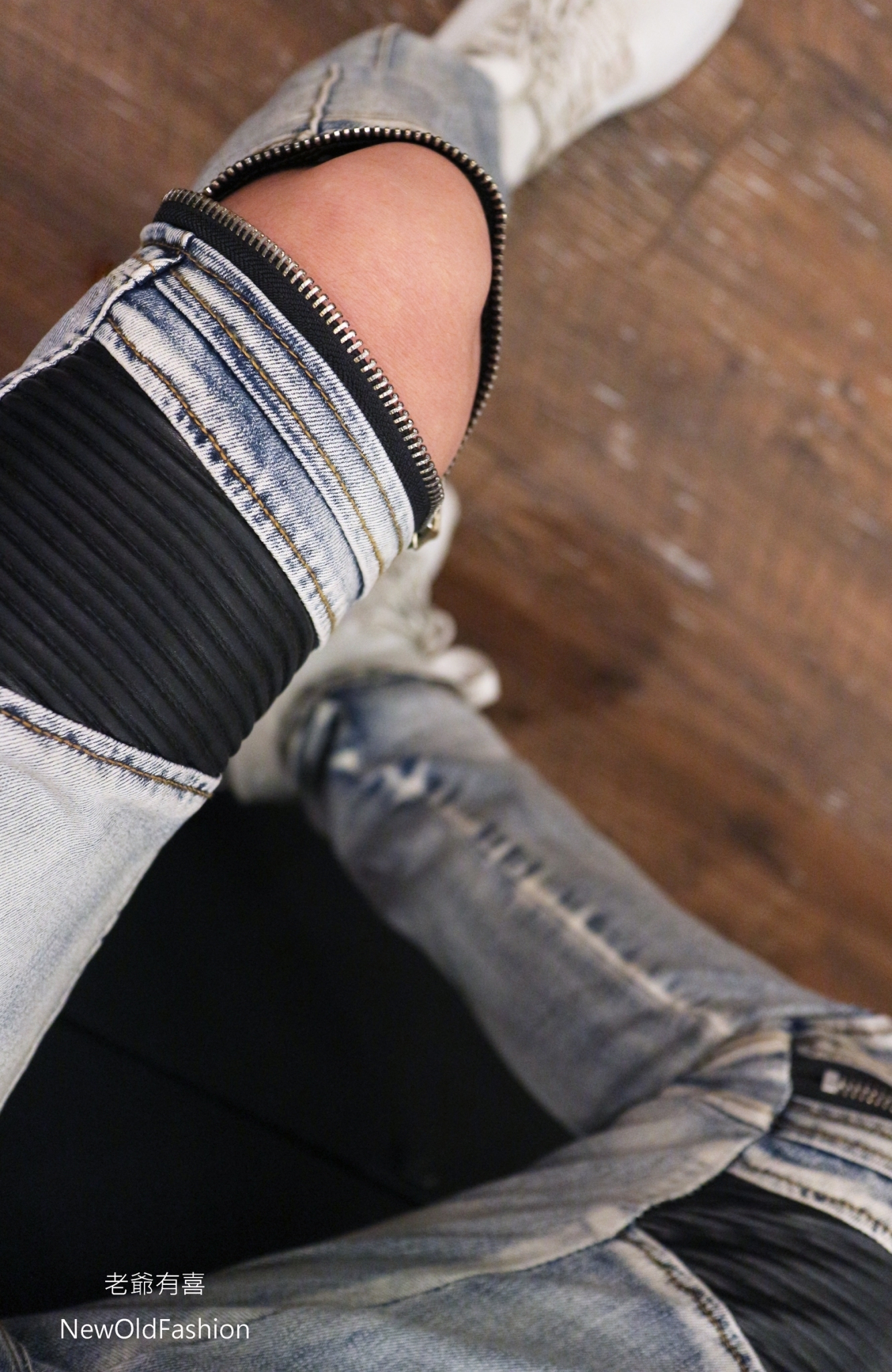 拼接波浪紋,膝破洞拉鍊設計!