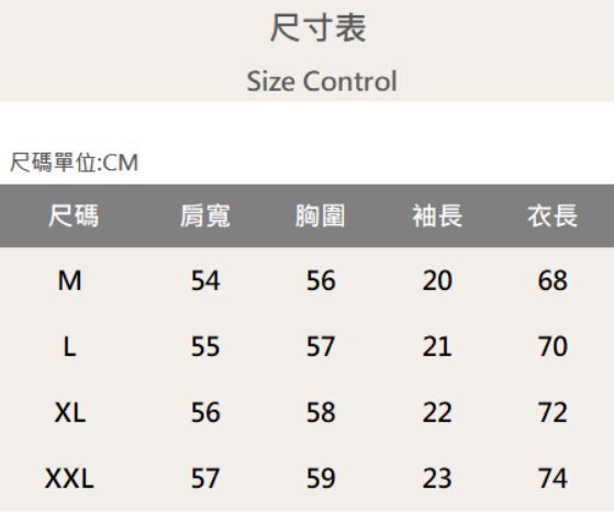 四個尺寸(M、L、XL、XXL)