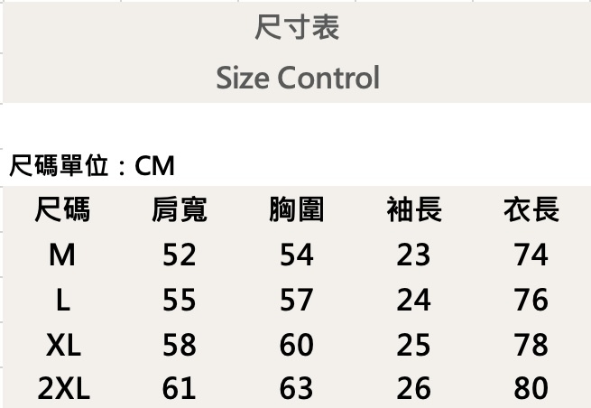 四個尺寸(M、L、XL、XXL)
