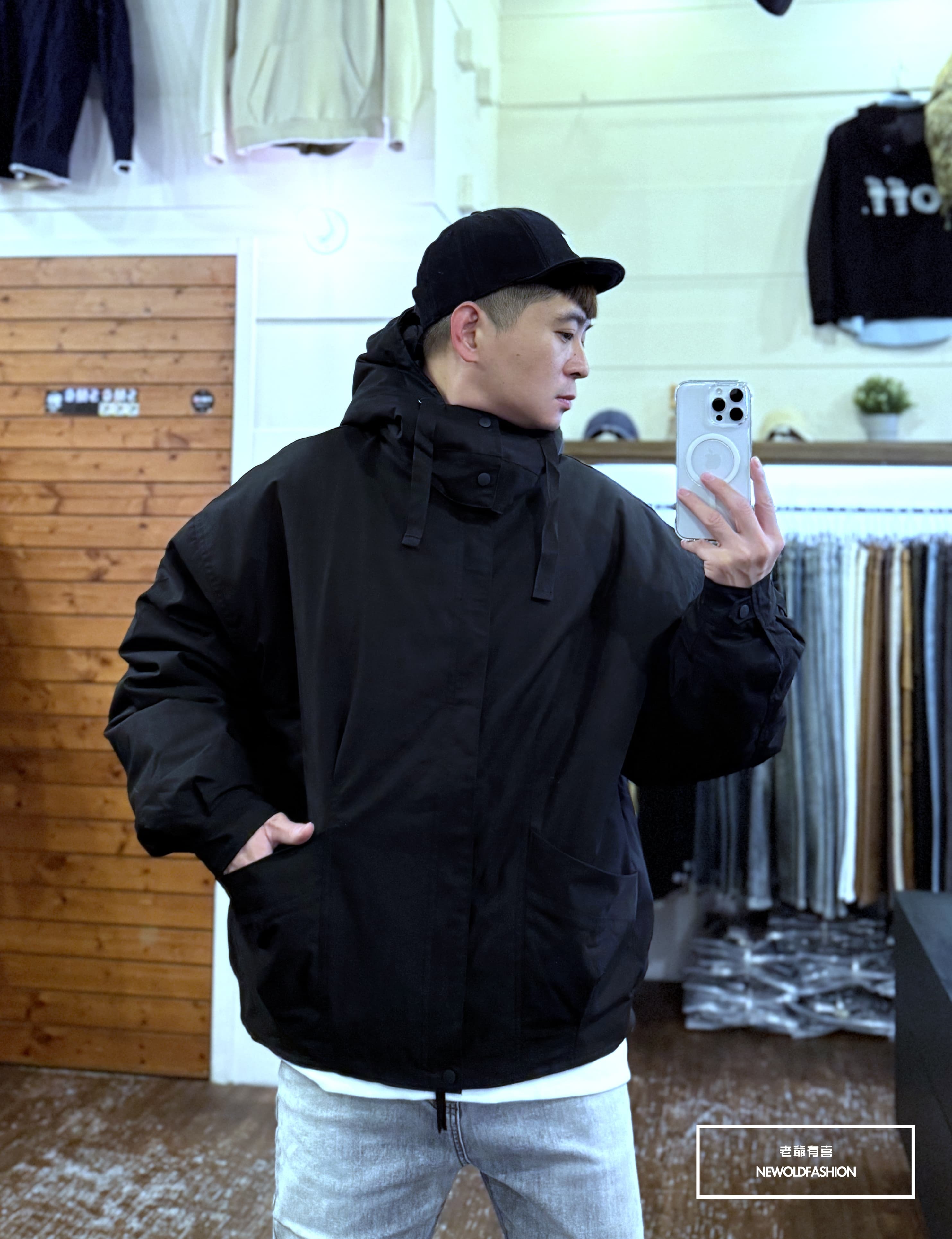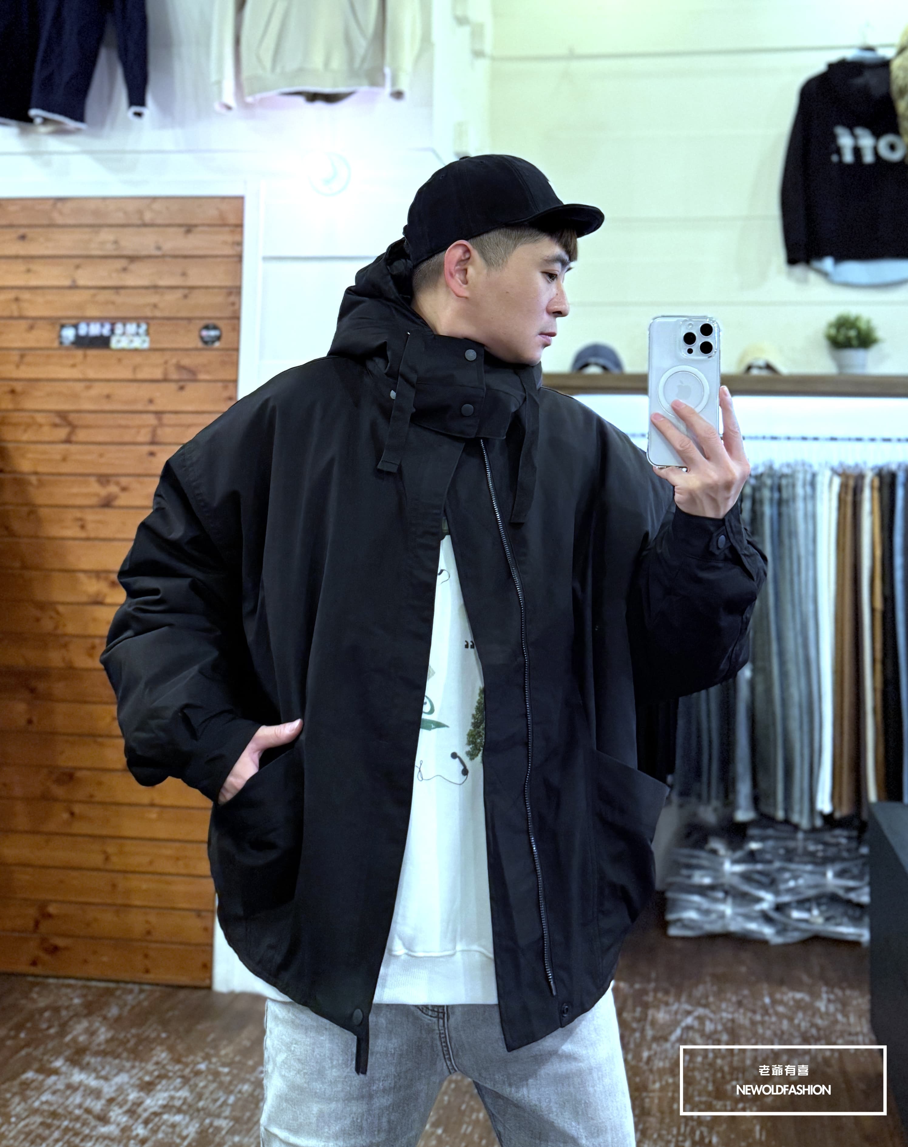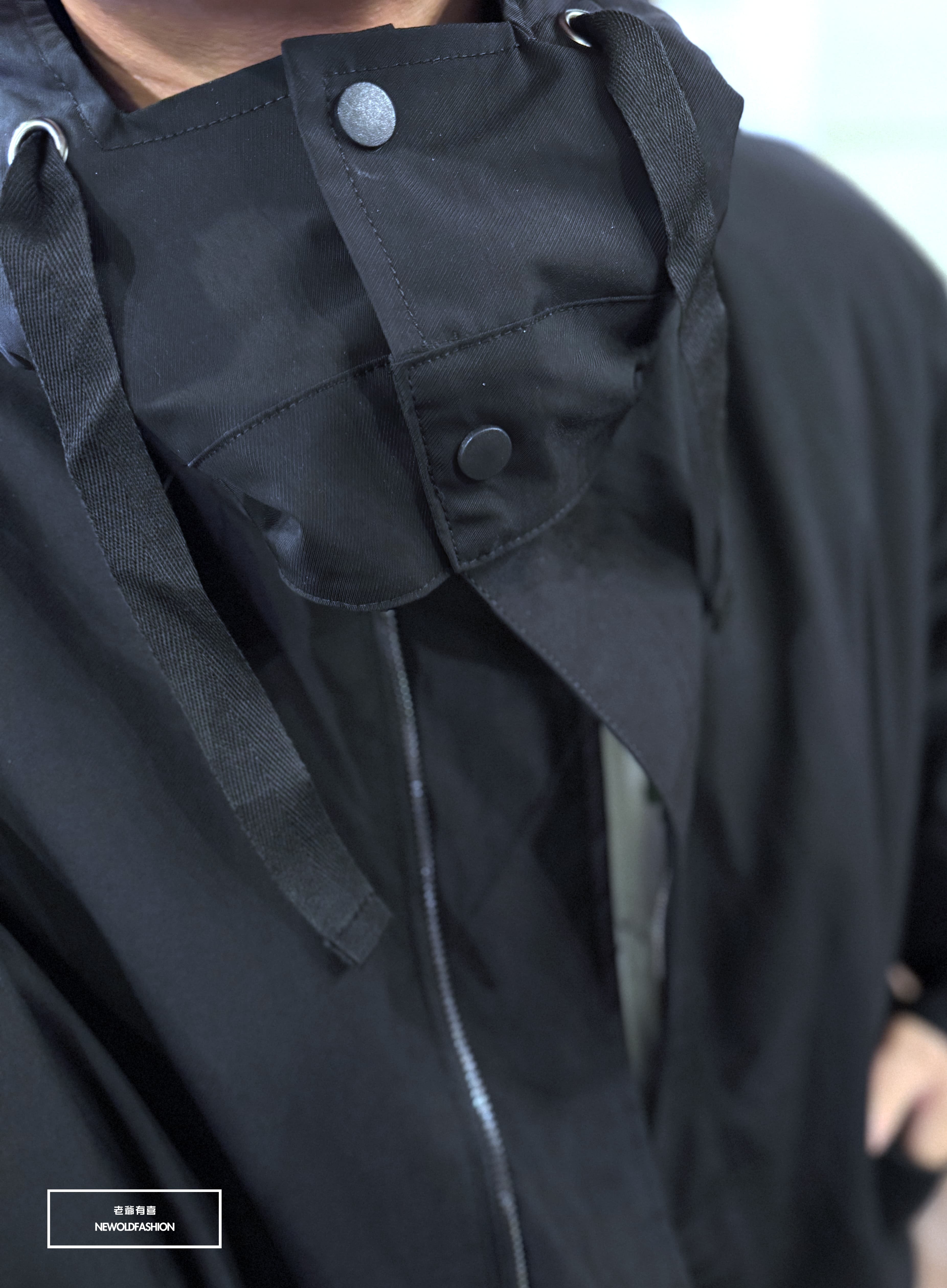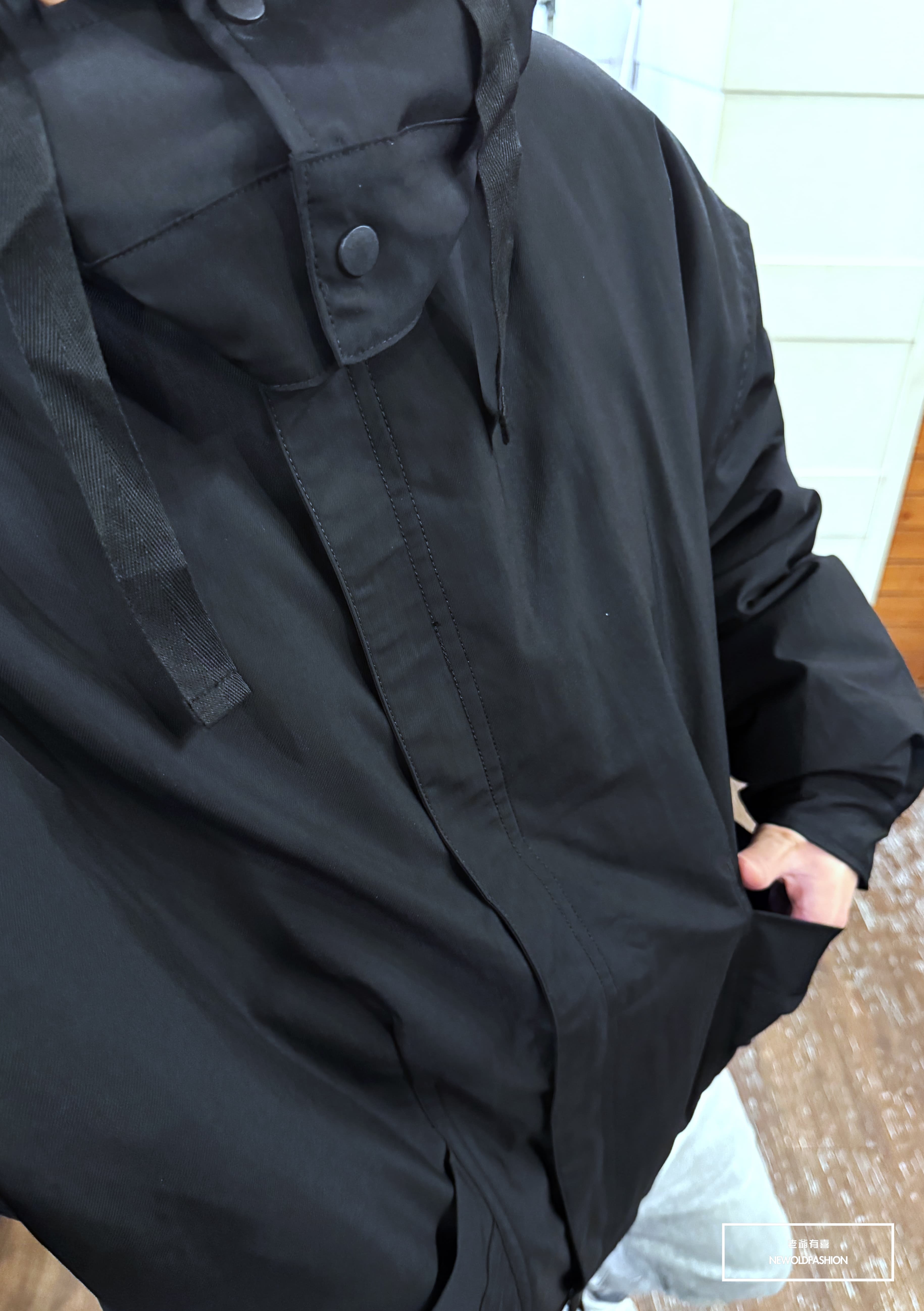 斜口袋造型,雙層防風門襟、釘釦連帽設計,可自行拆除為立領